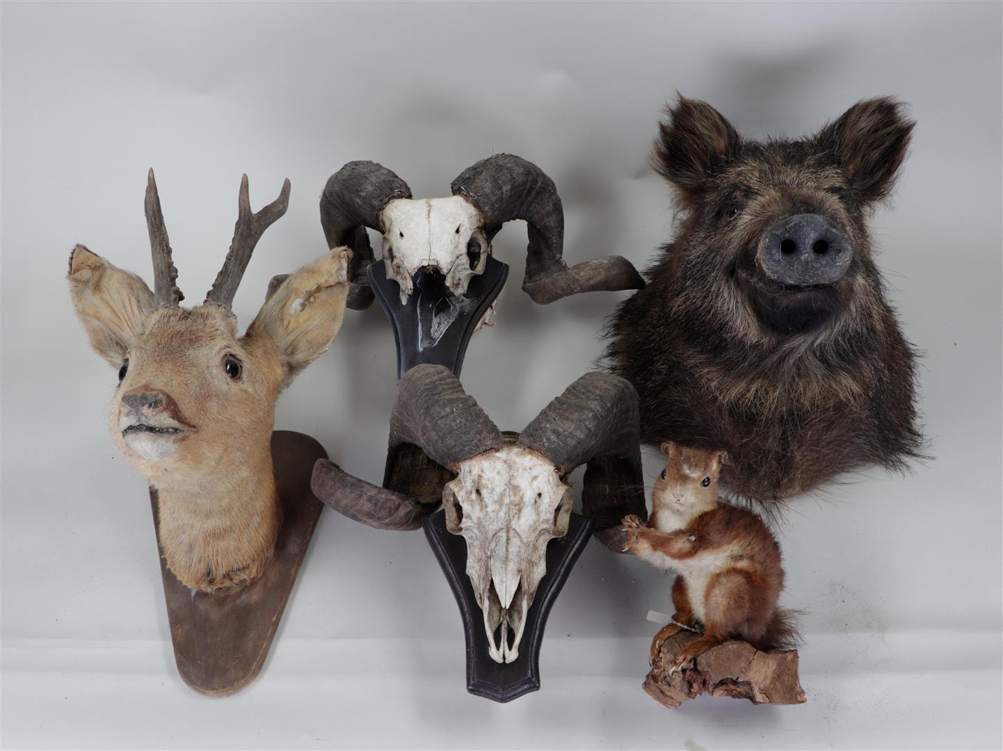 A lot of taxidermy consisting of two ram's antlers, an einkorn on a trunk, a roe deer antler and a boar's head.