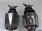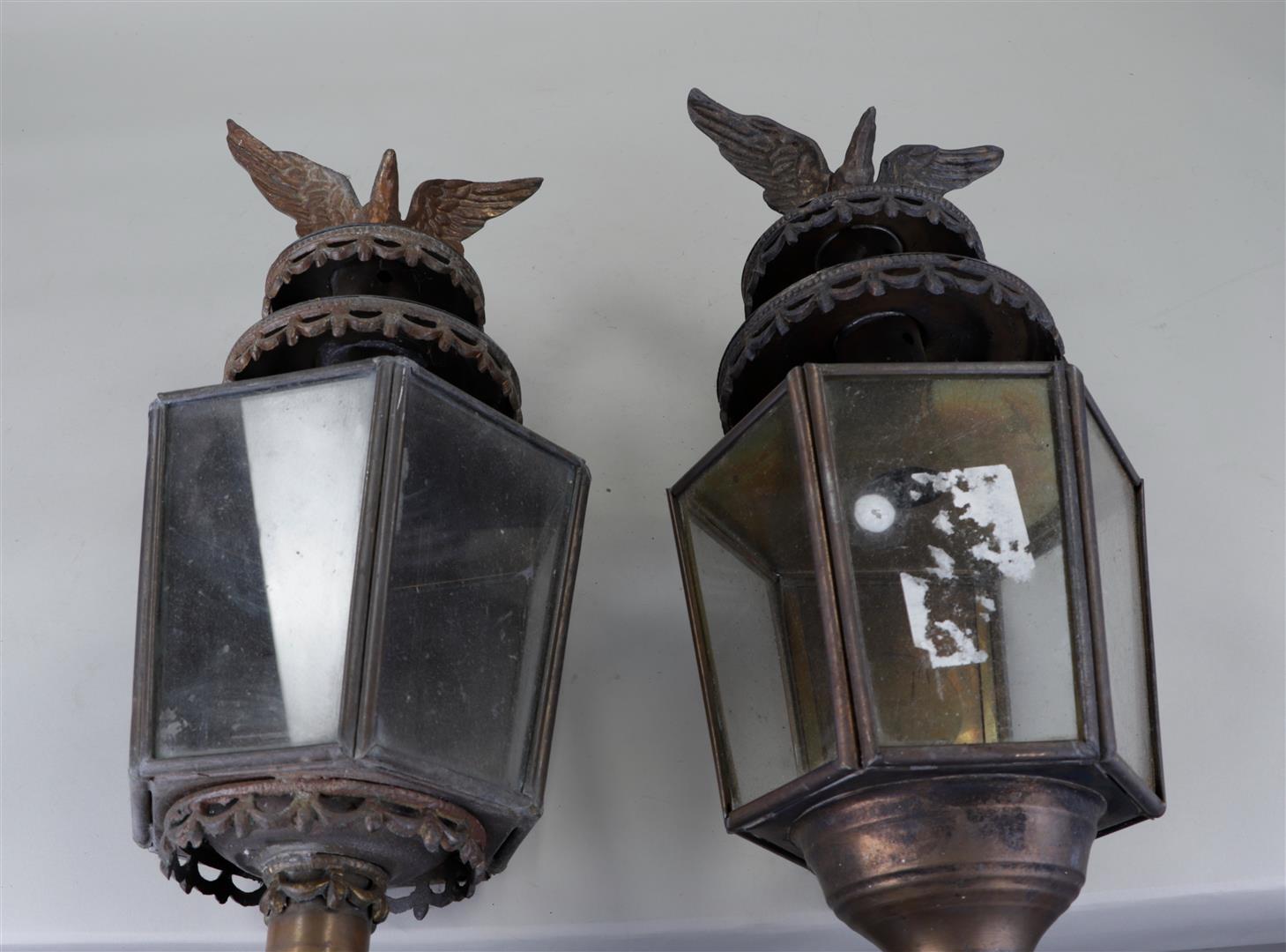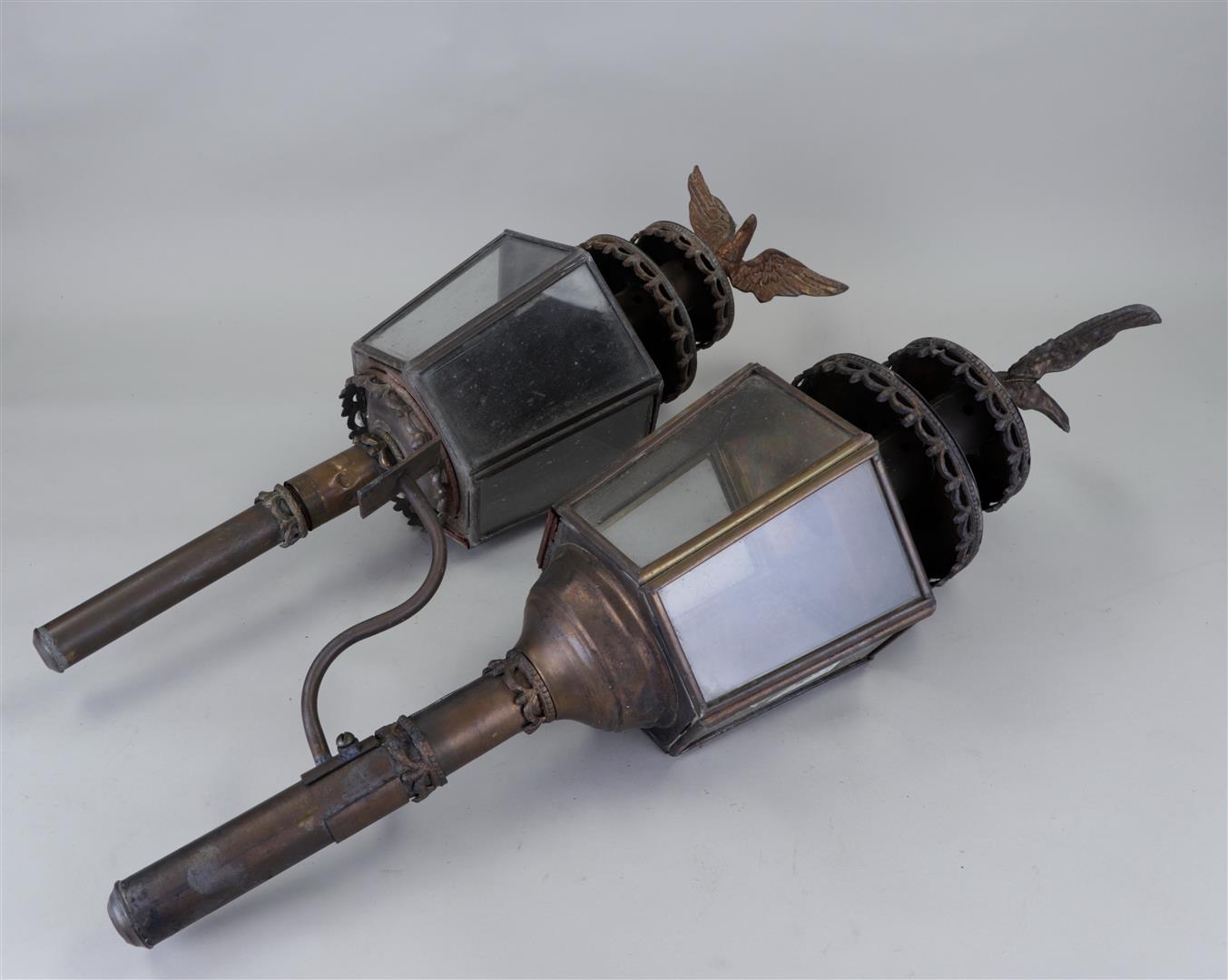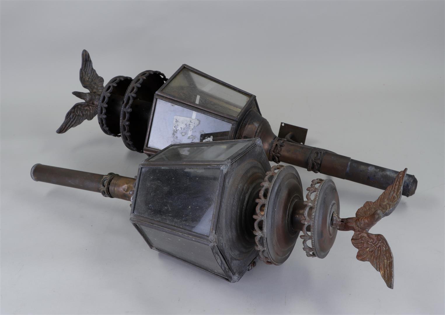 Set of two copper carriage lamps with an eagle above them.L. 70 cm.