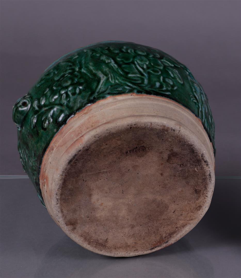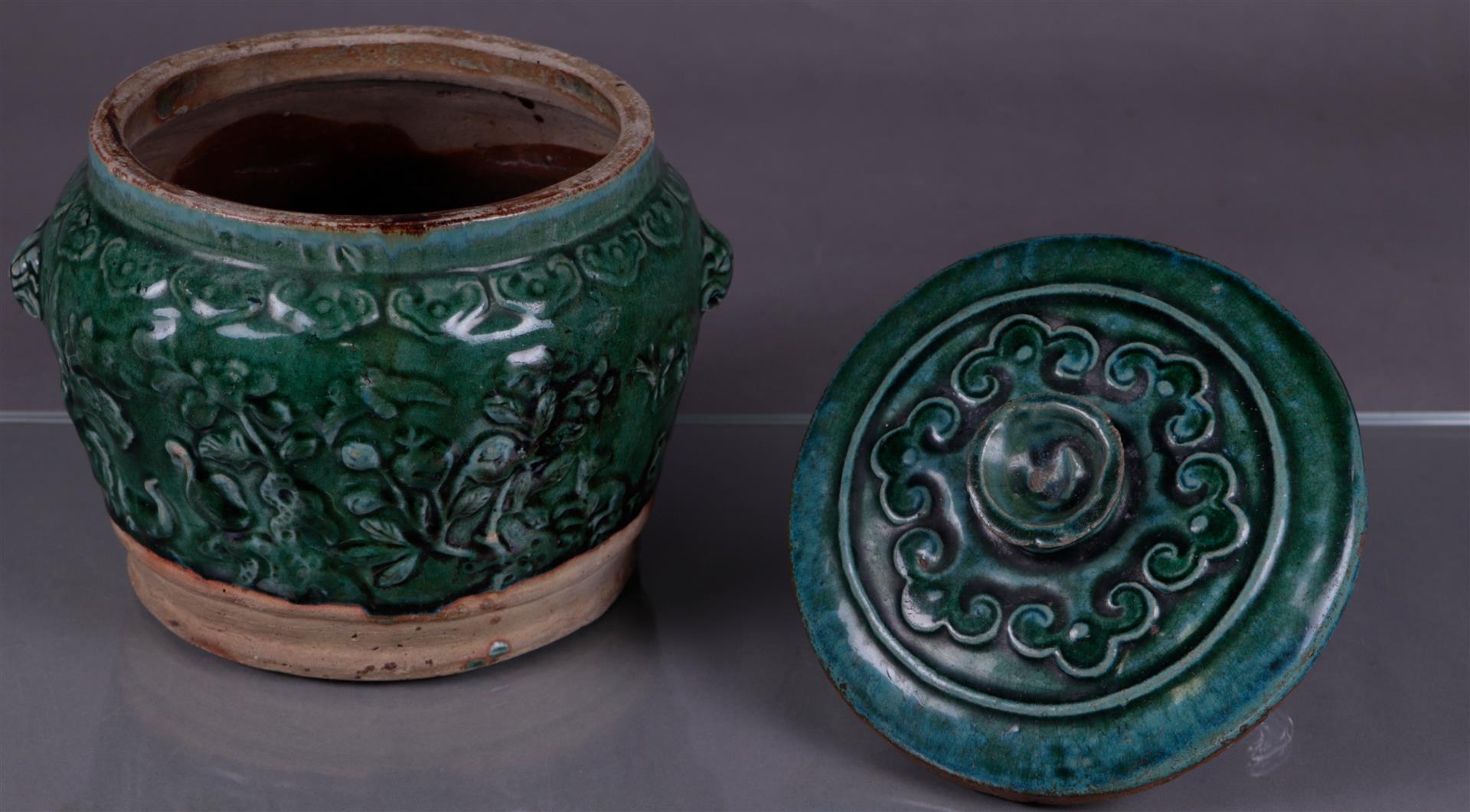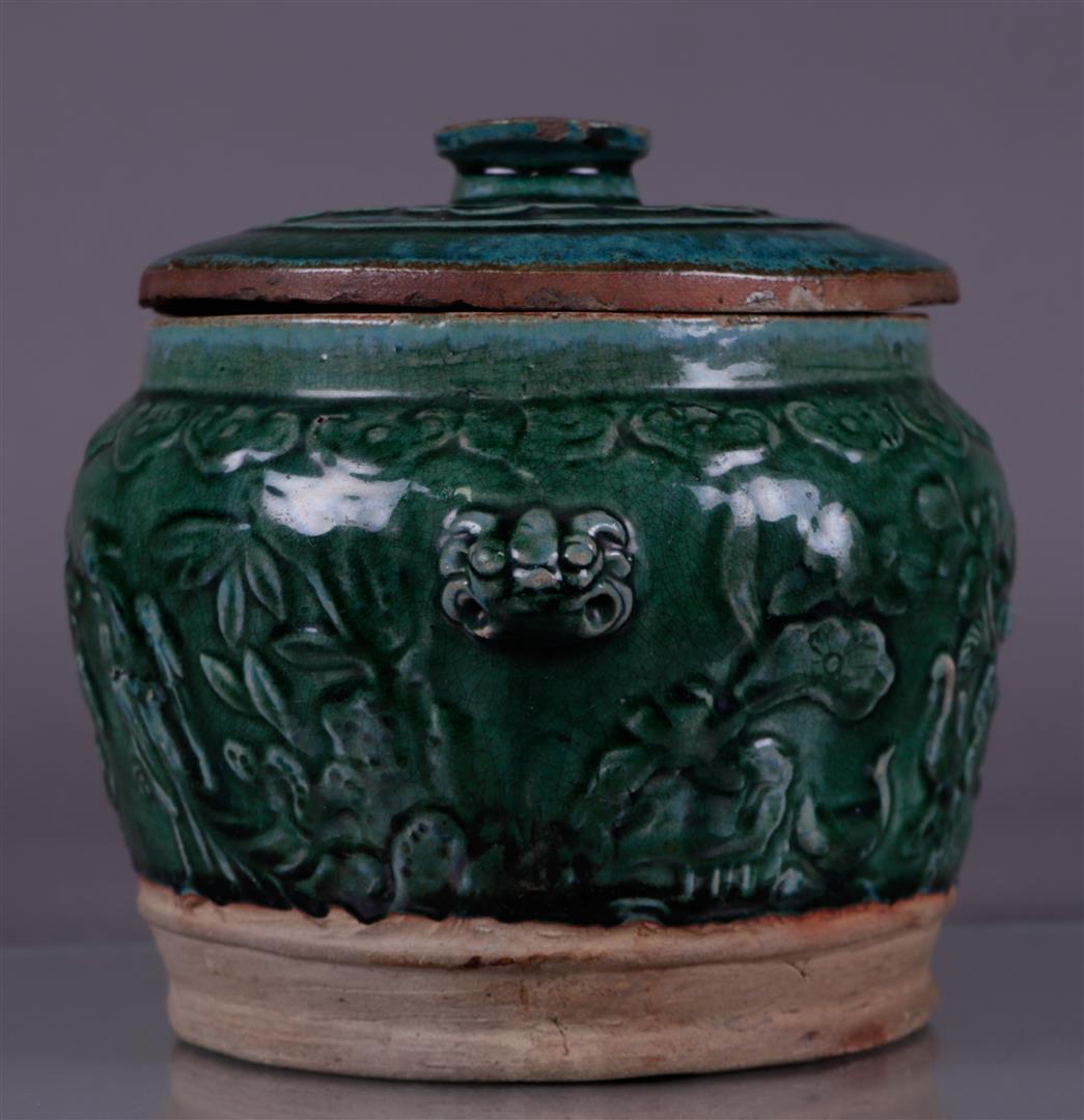 A green glazed lidded container. China, Ming?Diam. 24 cm.