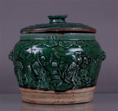 A green glazed lidded container. China, Ming?