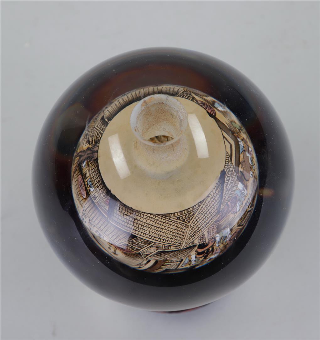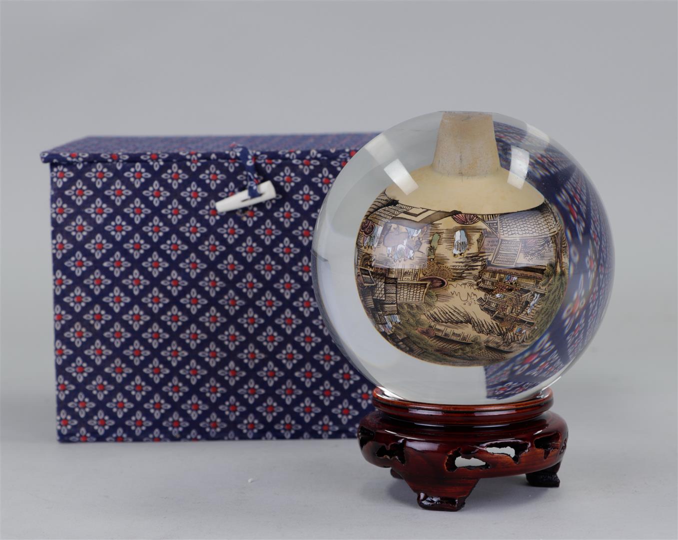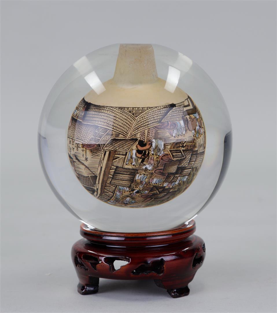 A hand-painted glass globe on a wooden stand. China, 20th century.
