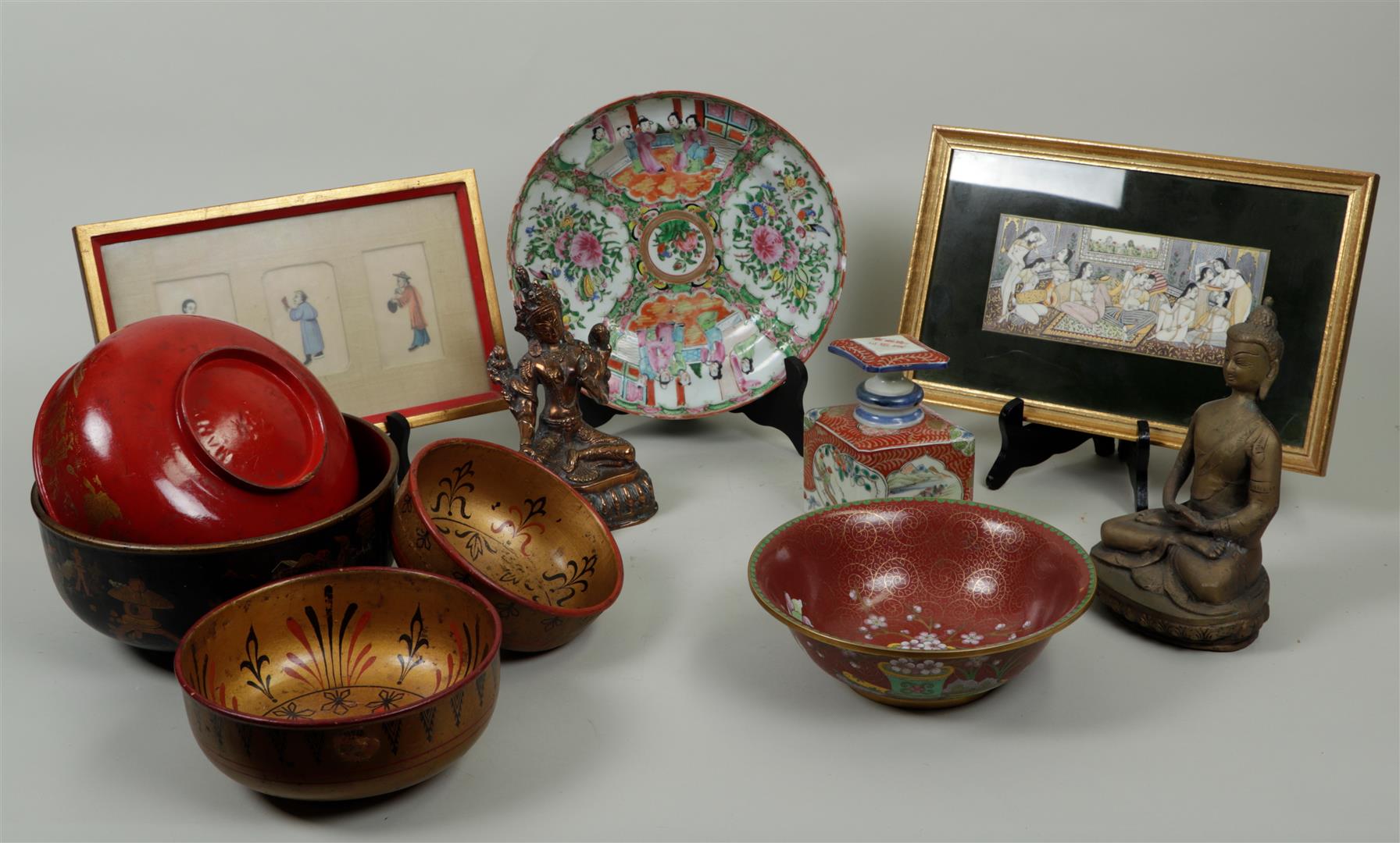 A lot of various Asian objects including bowls, Buddhas and porcelain.