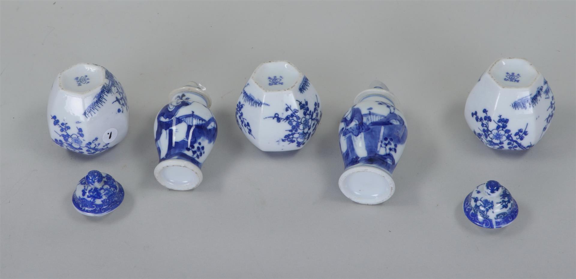 Collection of five blue and white angled lidded jars and two baluster vases with fools decoration, 19th century