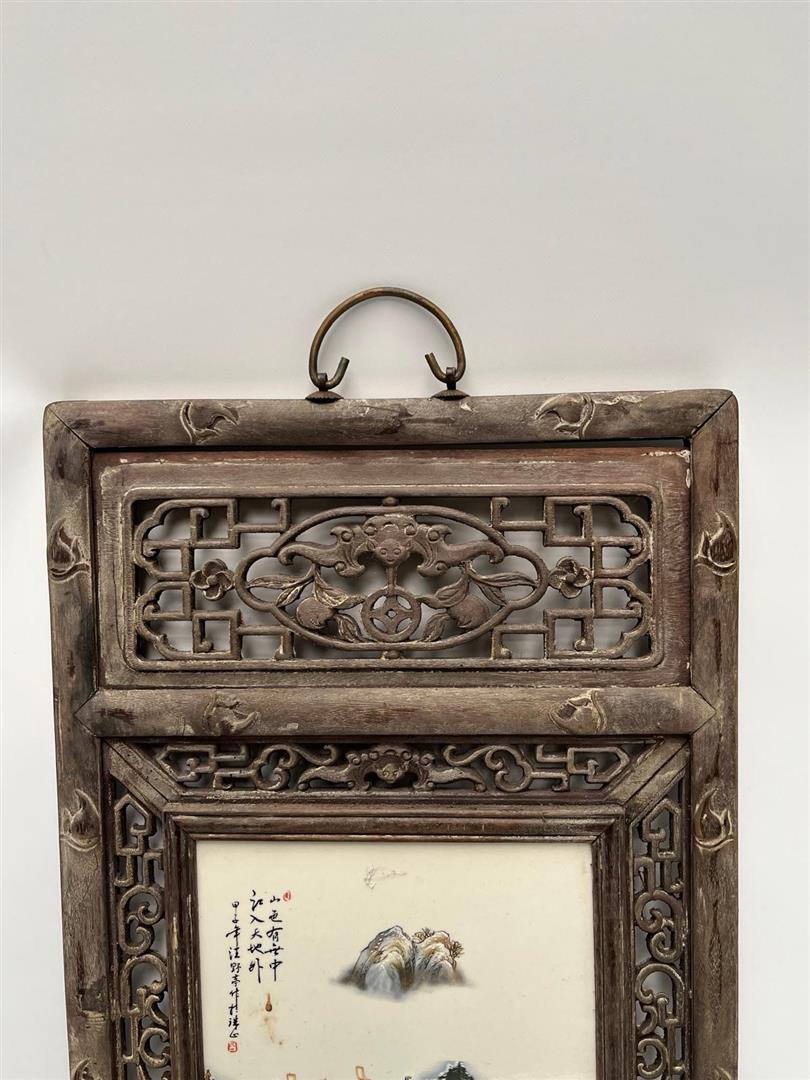 A set of four large Chinese porcelain plaques with landscape decoration in wooden frames.