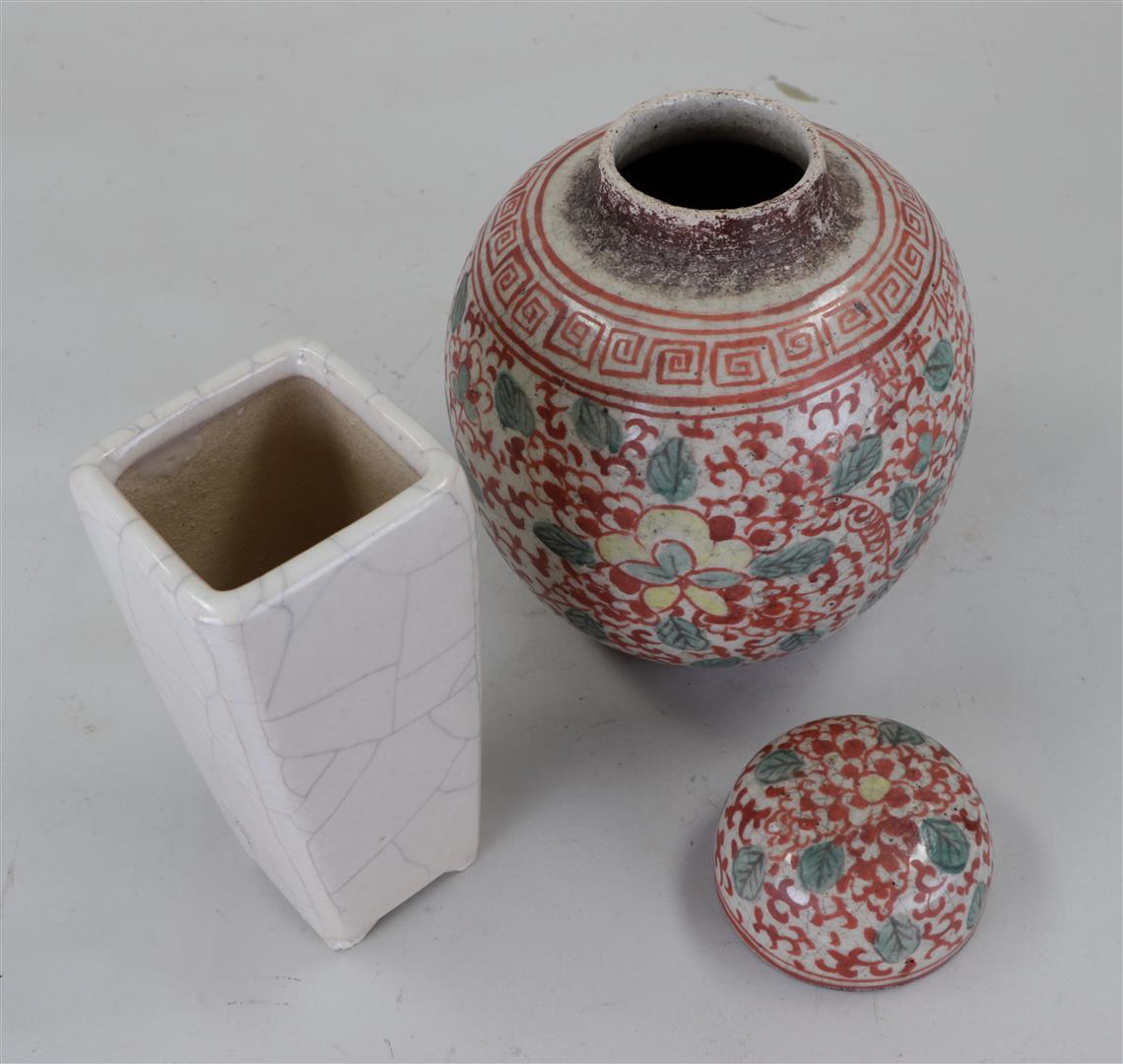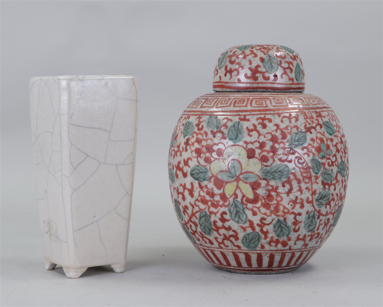 A lot consisting of a painted ginger jar and a crackle vase. China, early 20th century.