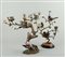 Two bronze candlesticks decorated with various earthenware birds. One bird is damaged.
