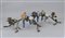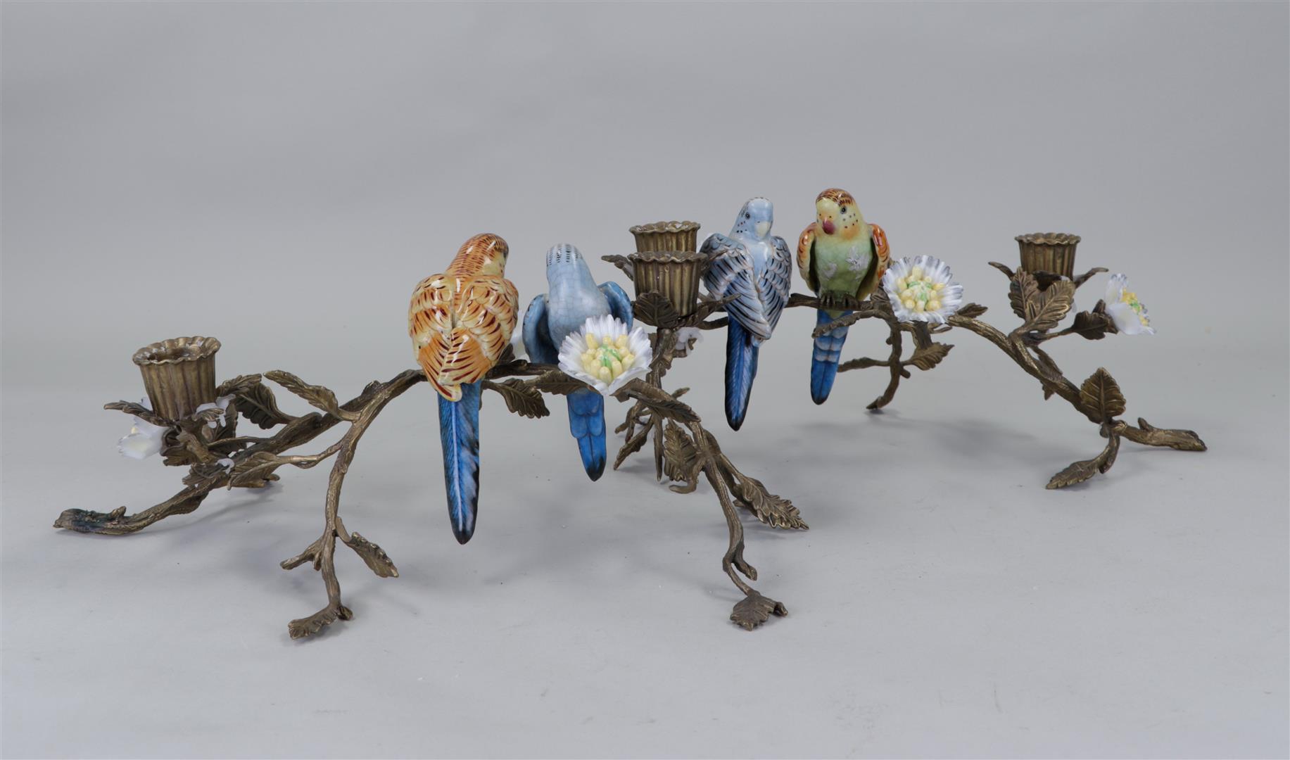 A set of bronze candlesticks with earthenware birds and flowers on them.15 x...