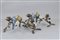 A set of bronze candlesticks with earthenware birds and flowers on them.