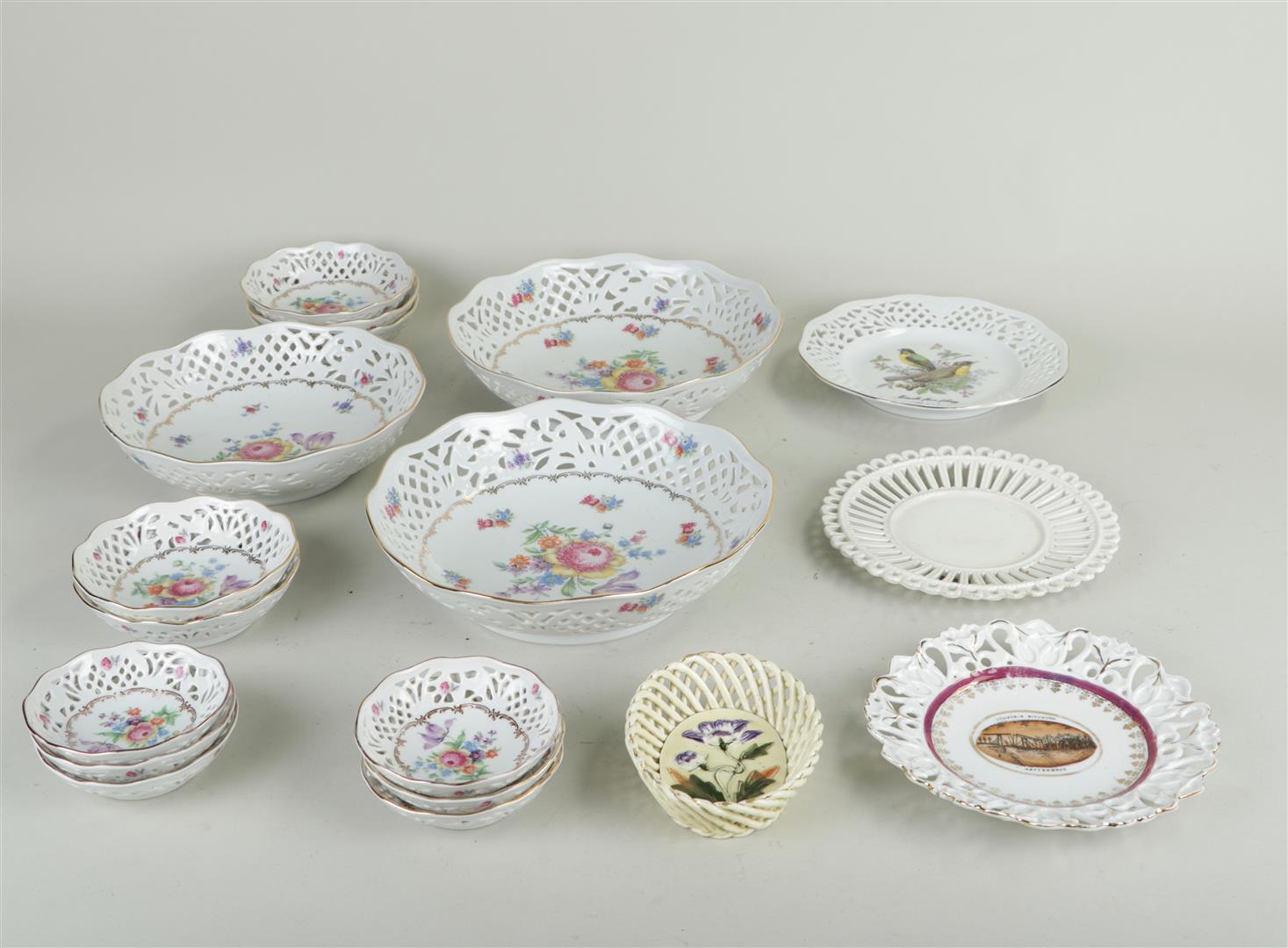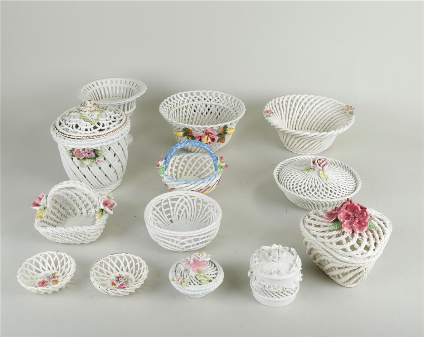 A collection of various porcelain items, including a large number of wickerwork baskets and bowls.