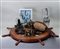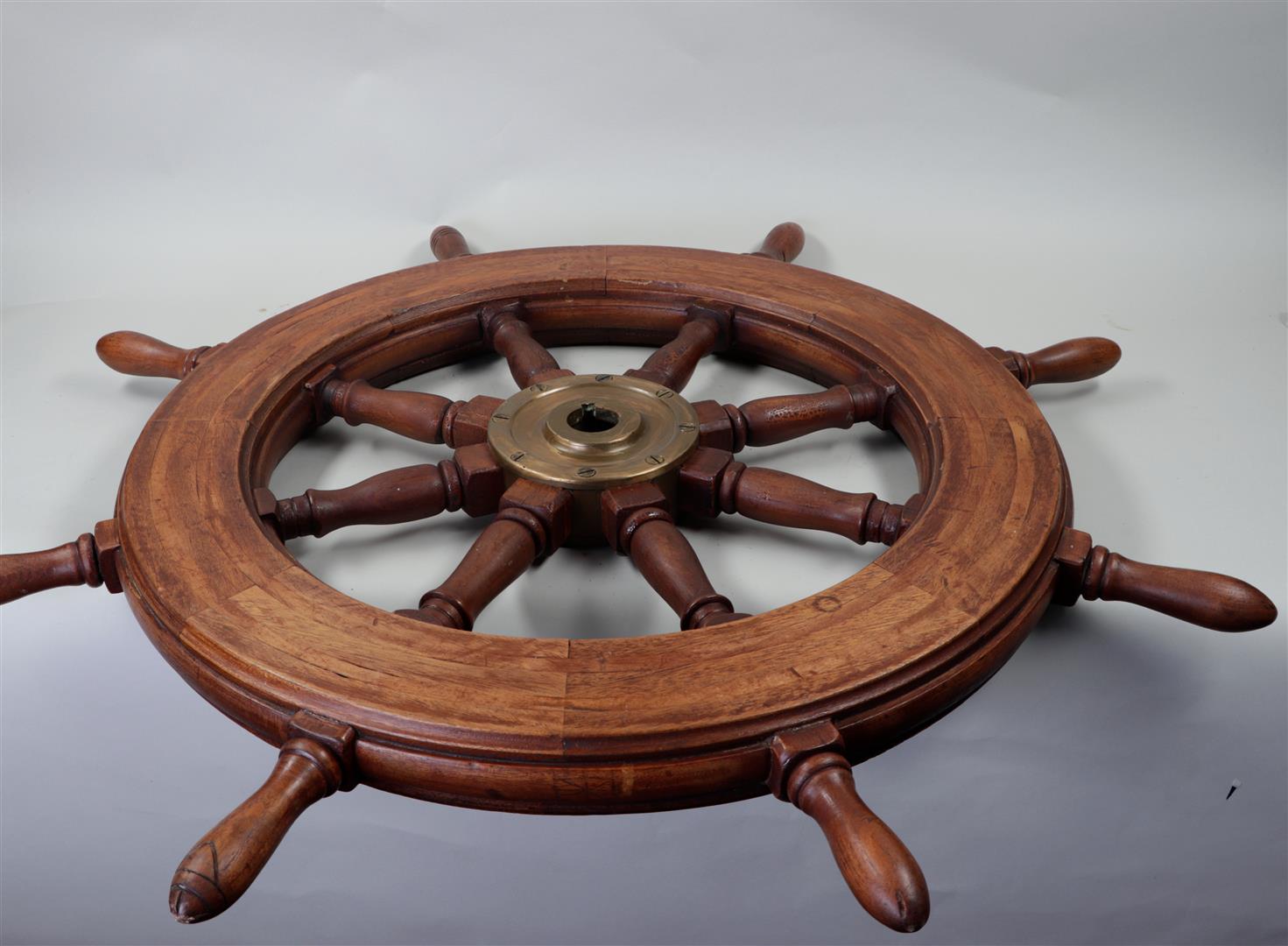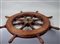 A lot of various nautical objects including a steering wheel, ship lamps and...