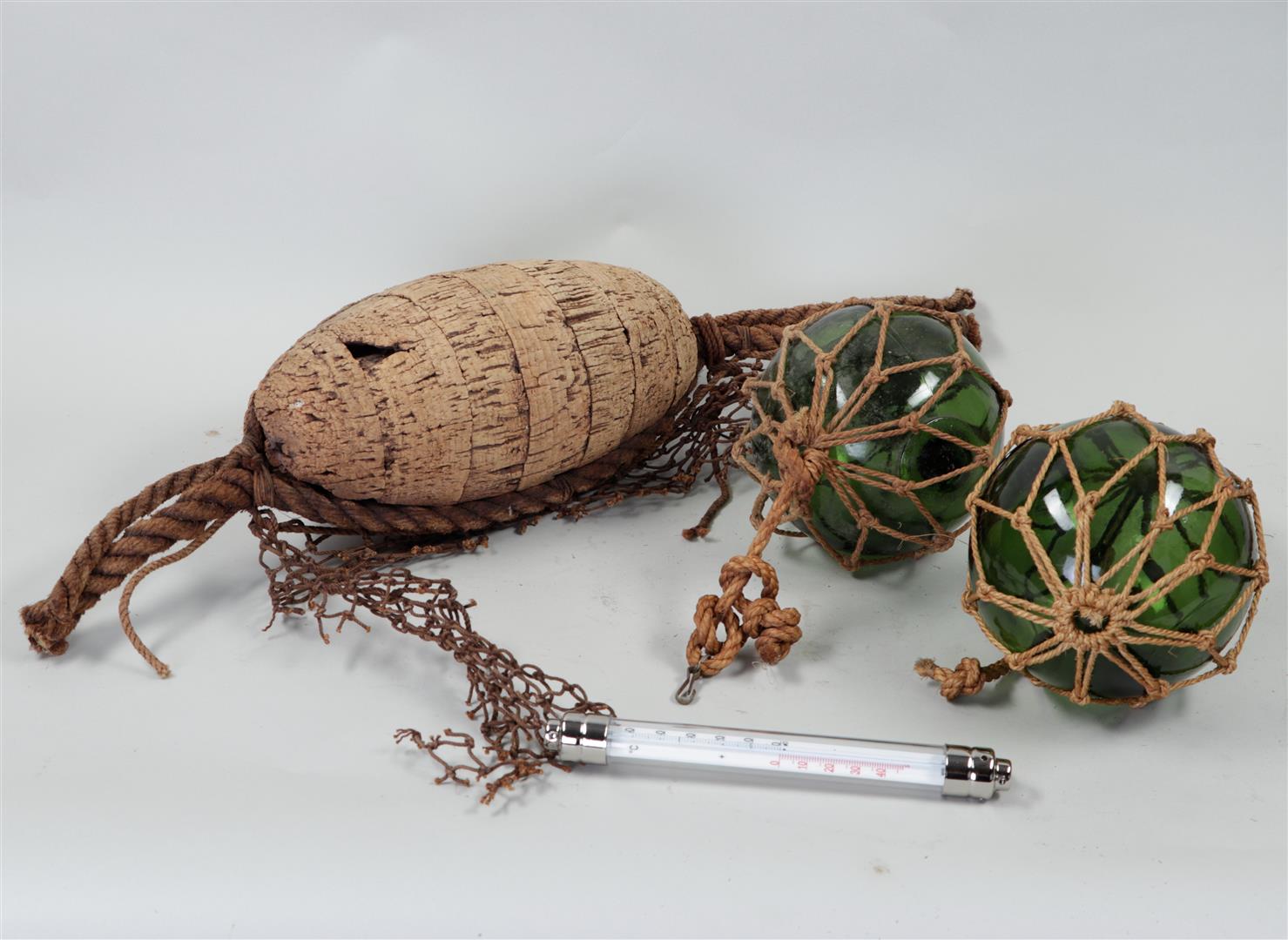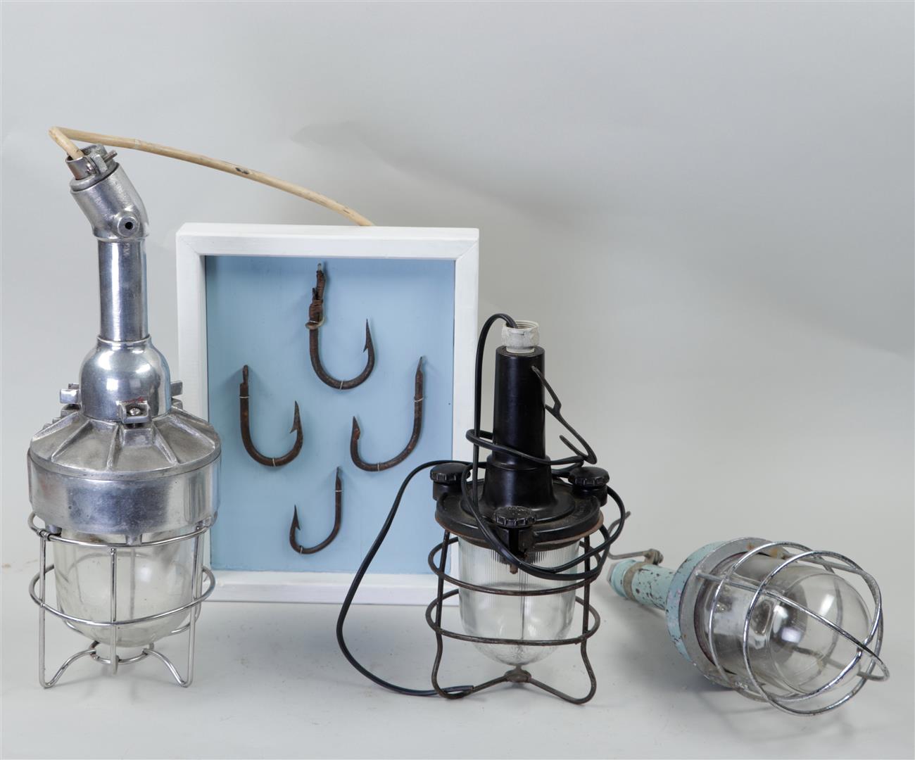 A lot of various nautical objects including a steering wheel, ship lamps and framed fish hooks.