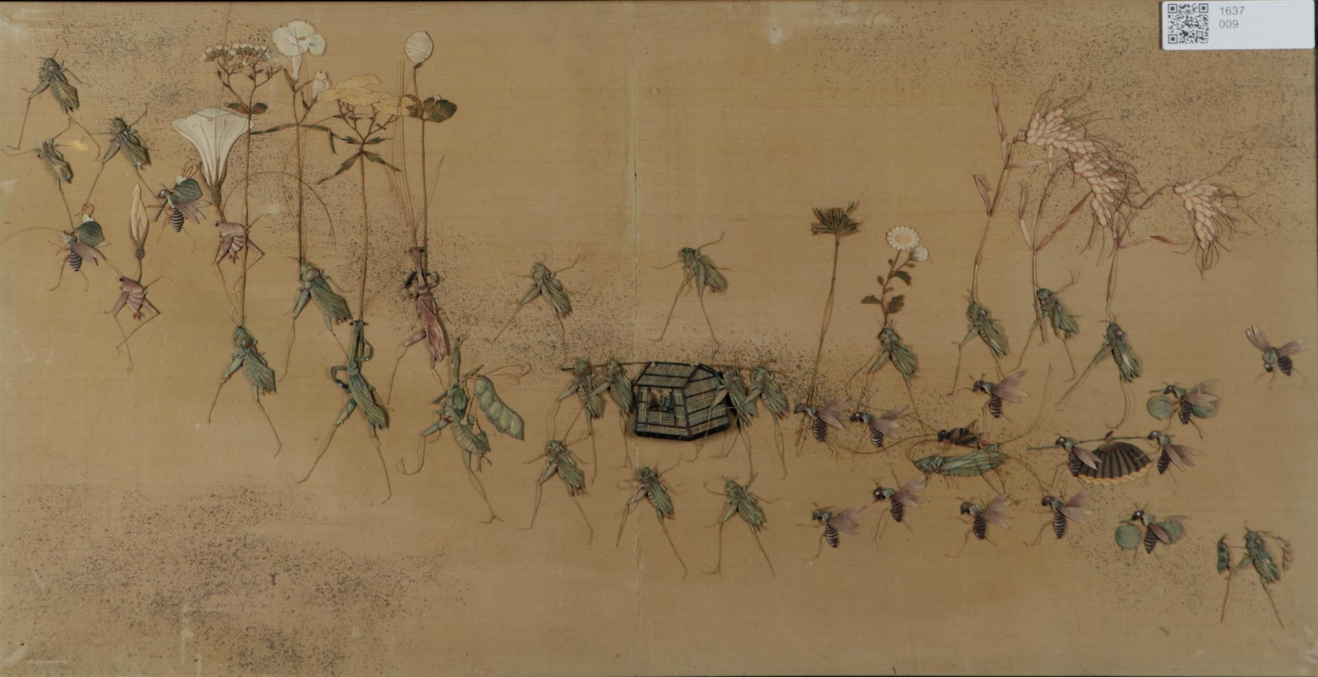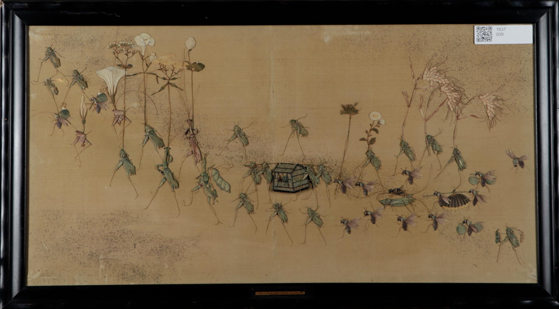 'Cortège de mariage de la cigales' - A representation of a wedding procession of crickets with a queen in a sedan chair, all made of dried flowers, Japan, end of Meiji.