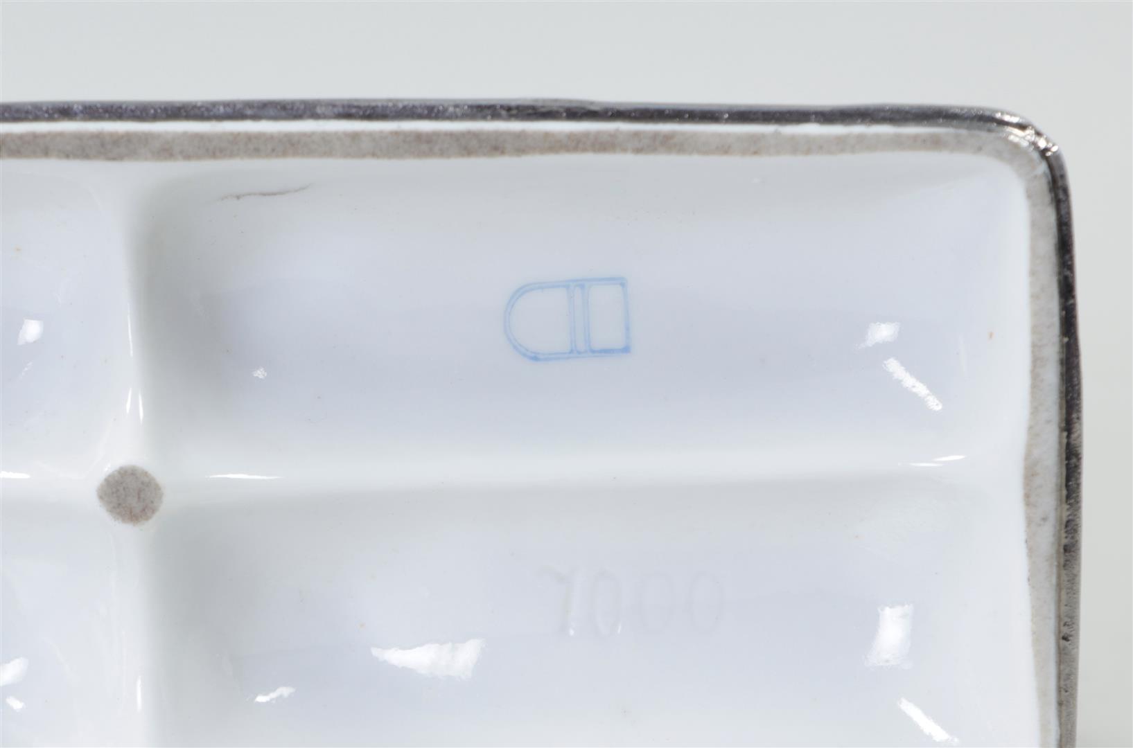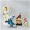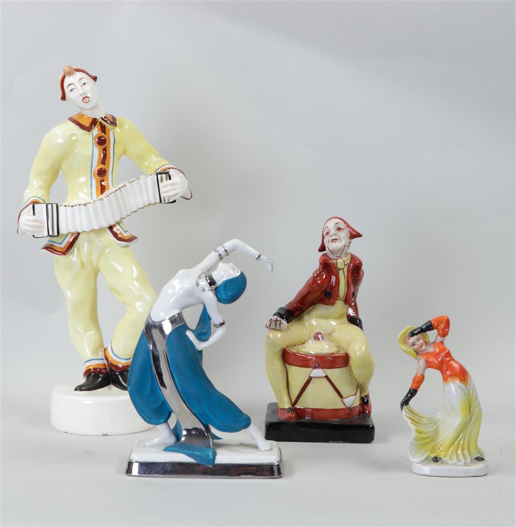 A polychrome earthenware figure of a bagpipe player, marked Royal Dux, accompanied by a porcelain inkwell and two Art Nouveau earthenware figures.