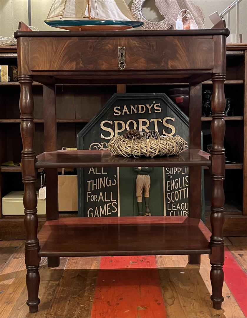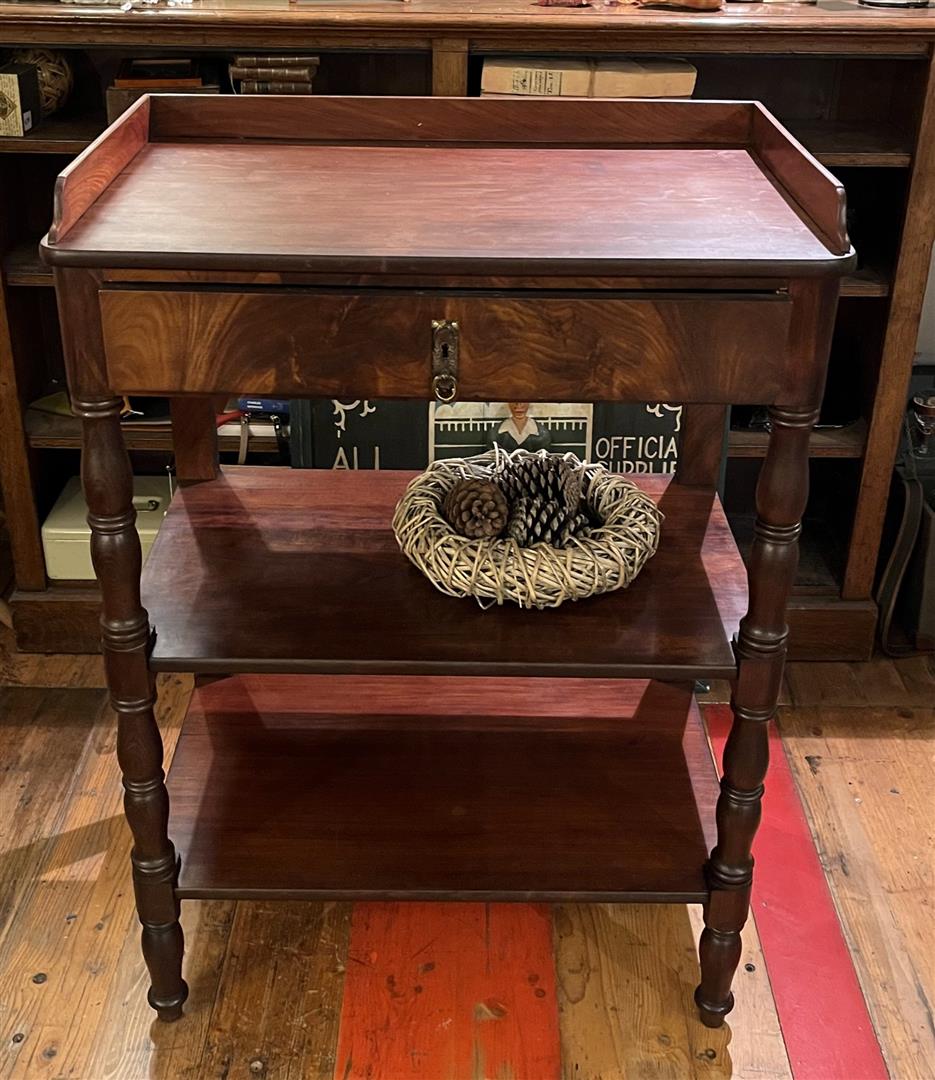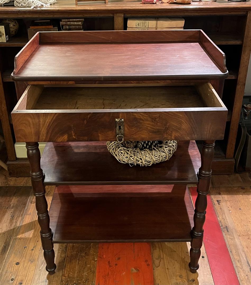 An English, mahogany etagere with drawer on turned legs. NB: The attributes...