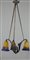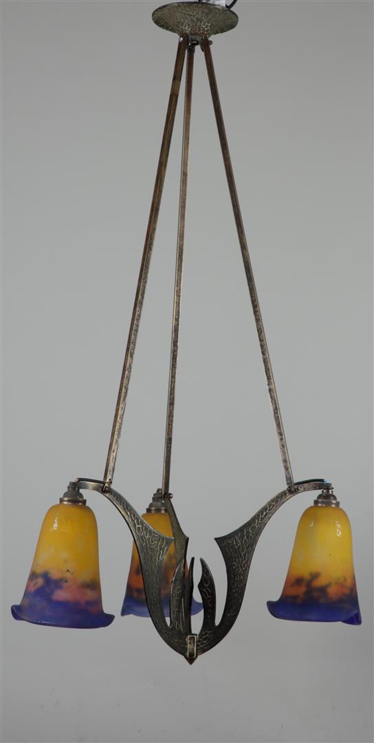 An Art Nouveau brass pendant lamp with multi-coloured glass shades.