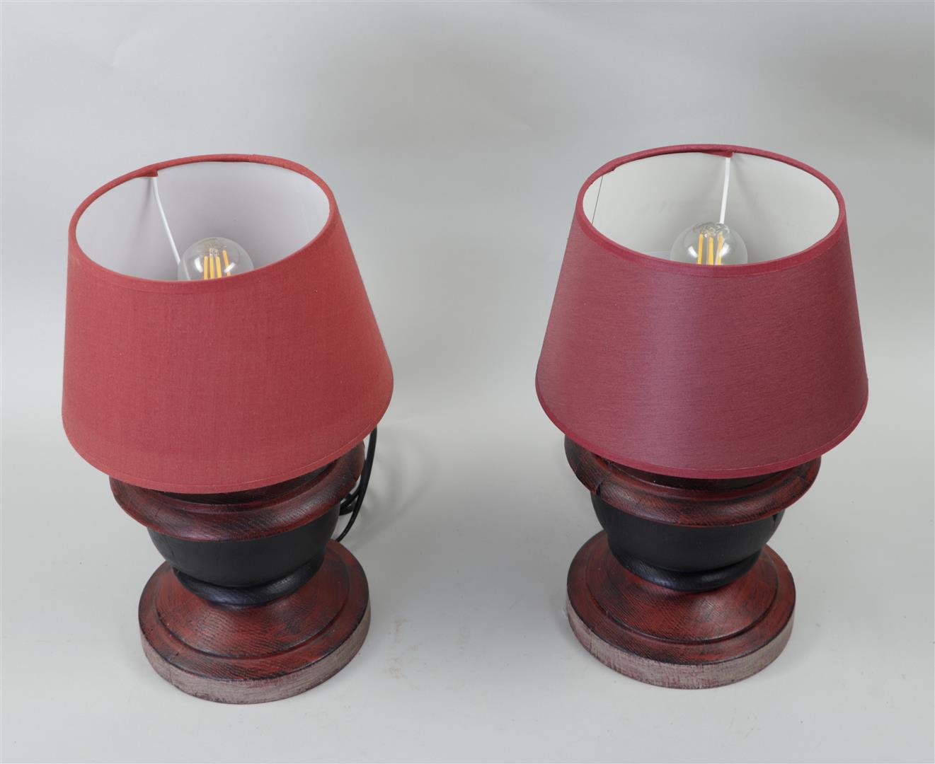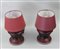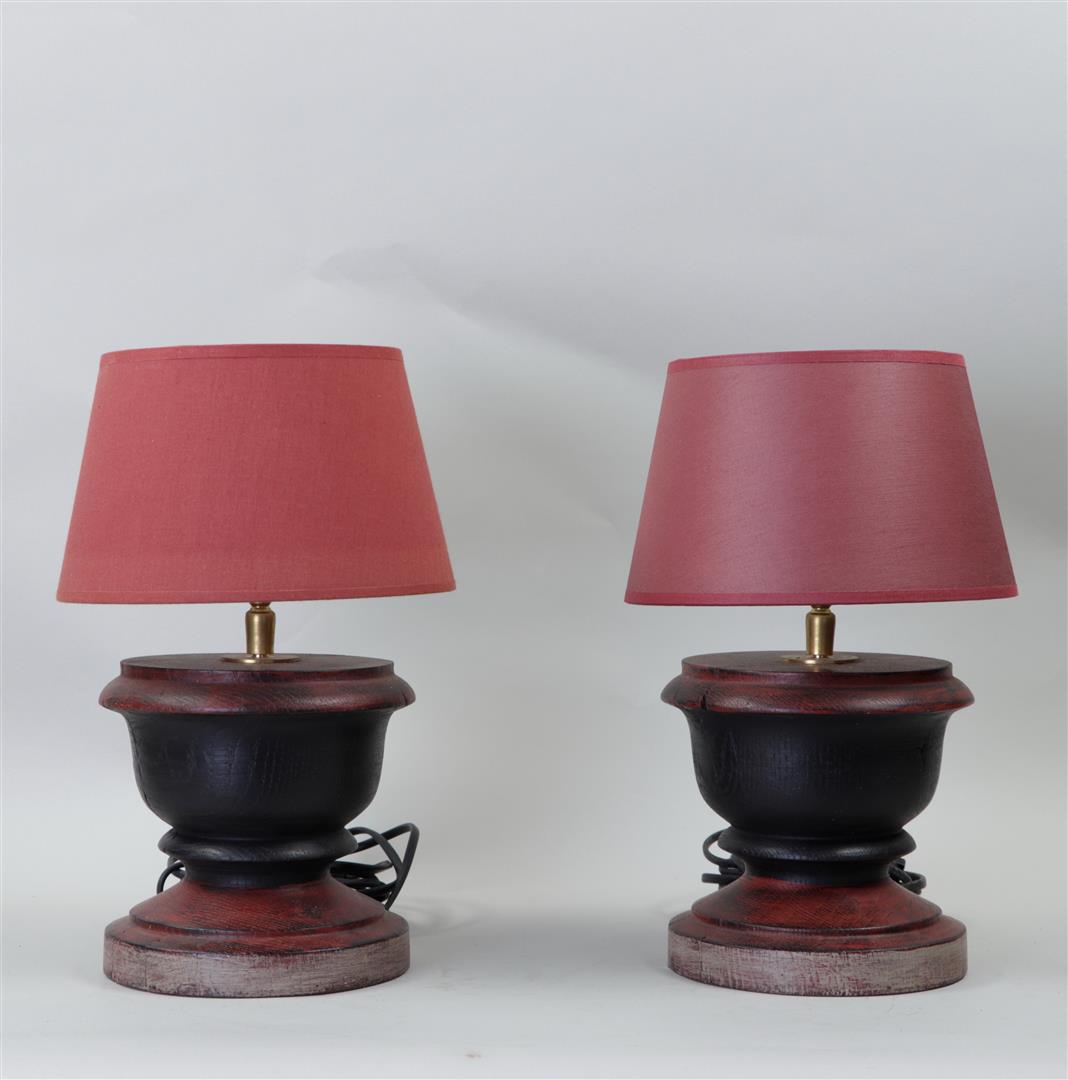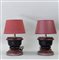 A lot of (2) cabinet feet made into table lamps. On top a red hood. H.: 32 cm.