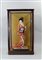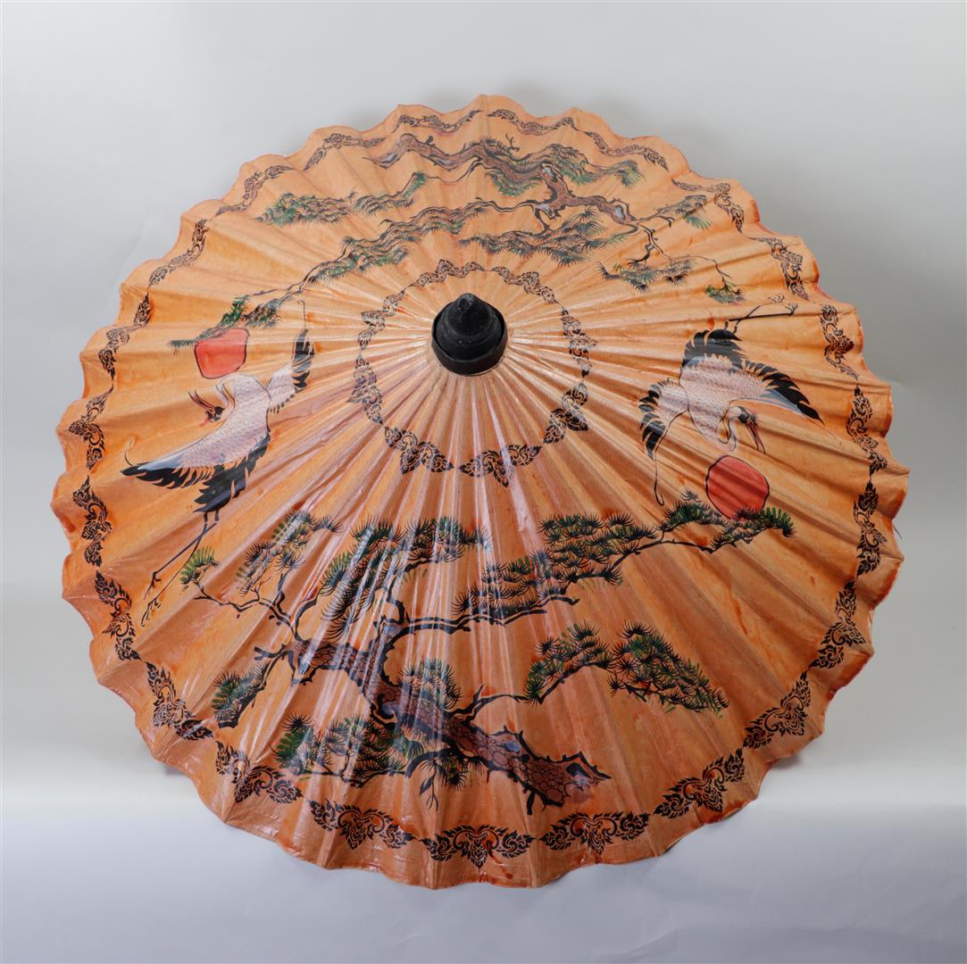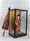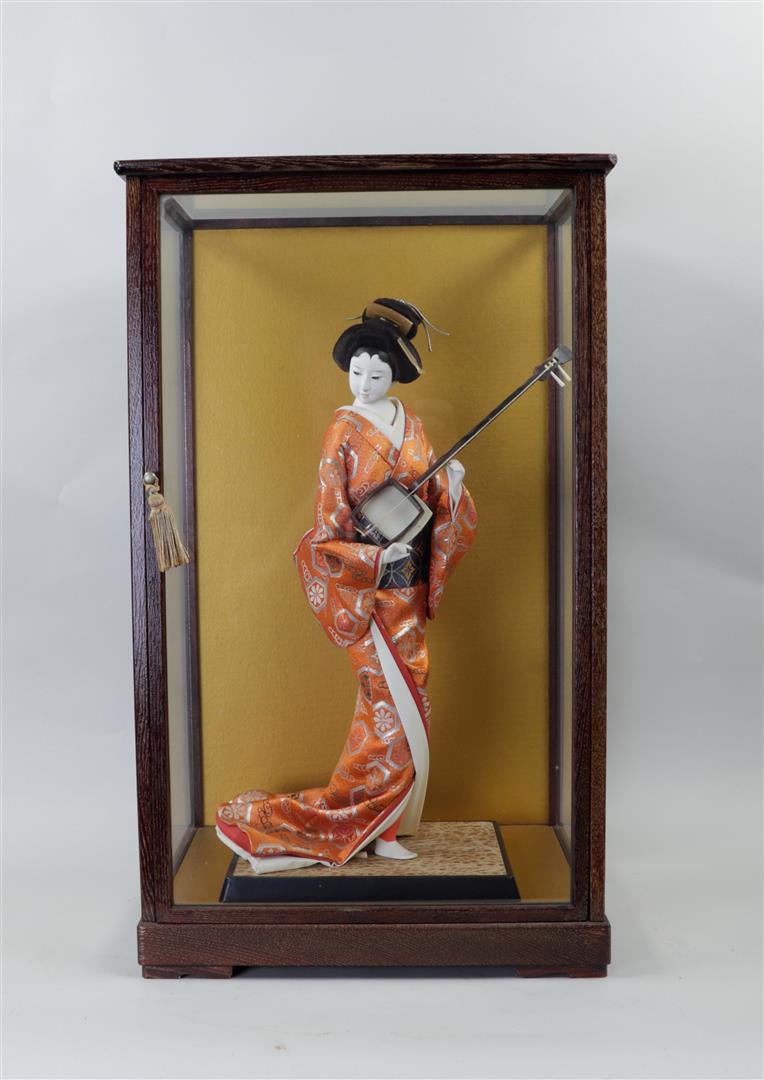 A Japanese Geisha doll in a display case, with a hand-painted paper umbrella.
