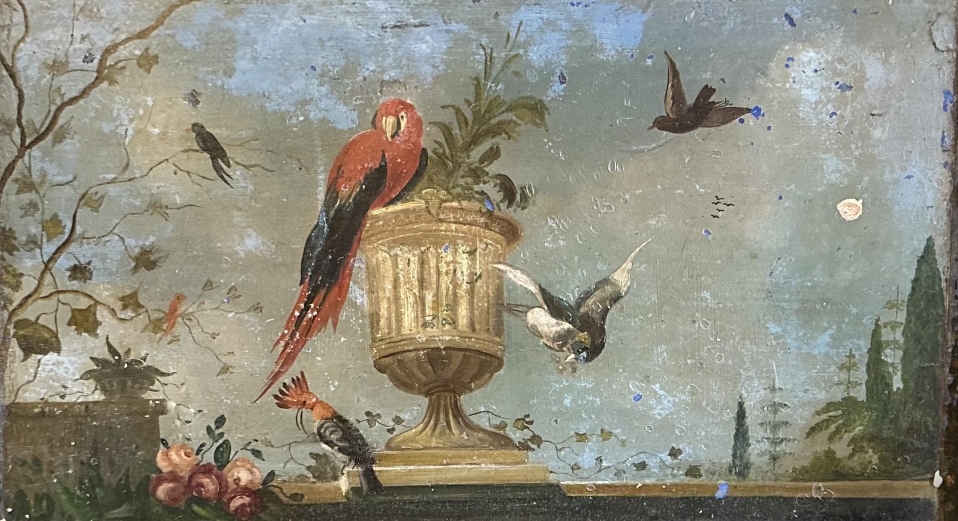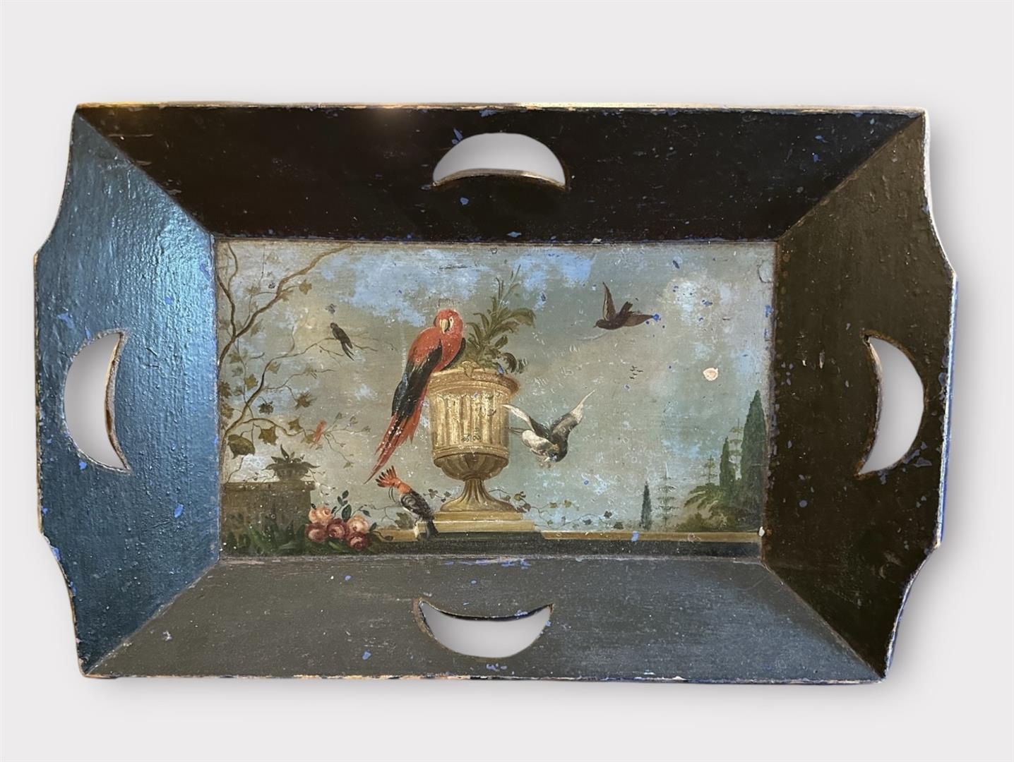 A wooden tray, with folk art painting of birds 19th century.
