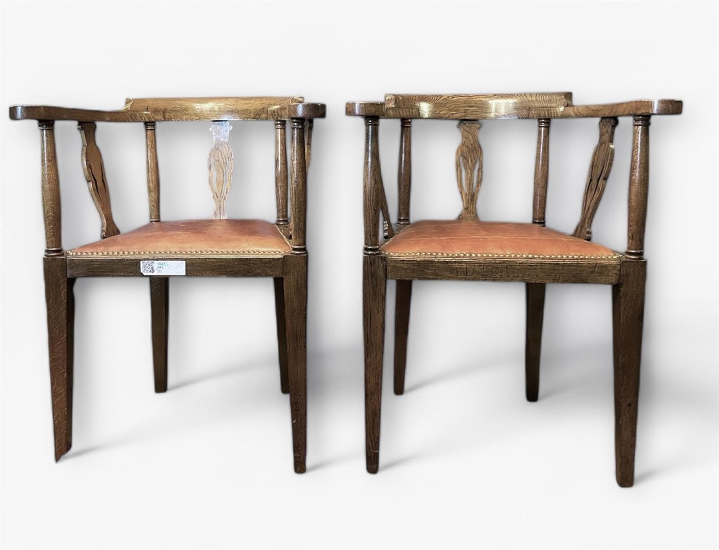 Lot 82 | A set of (2) oak horseshoe chairs with cognac leather upholstery, ca. 19th...