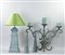 A lot consisting of a large copper 3 light candlestick, two copper obelisks and a green colored lamp.