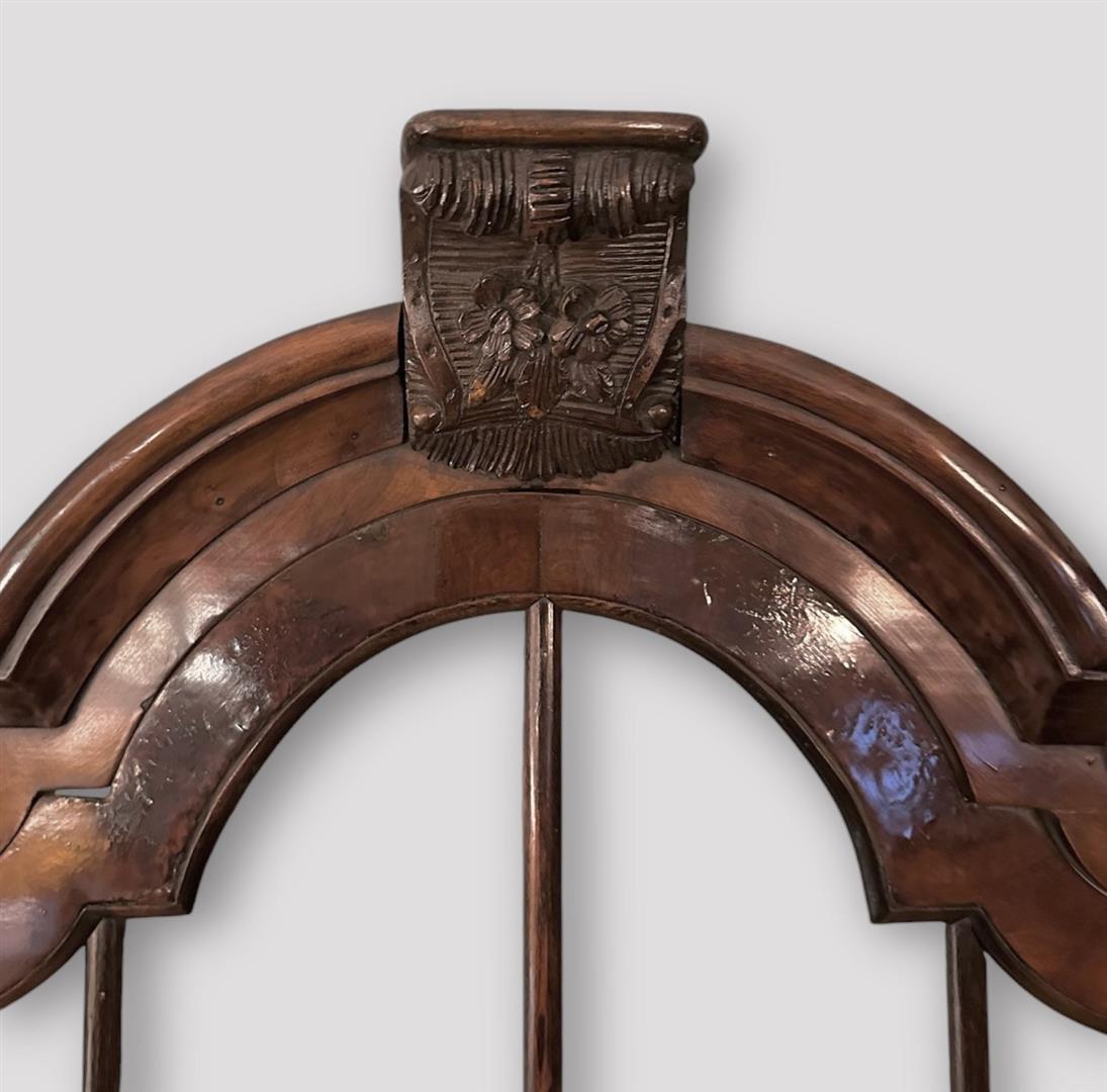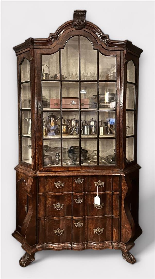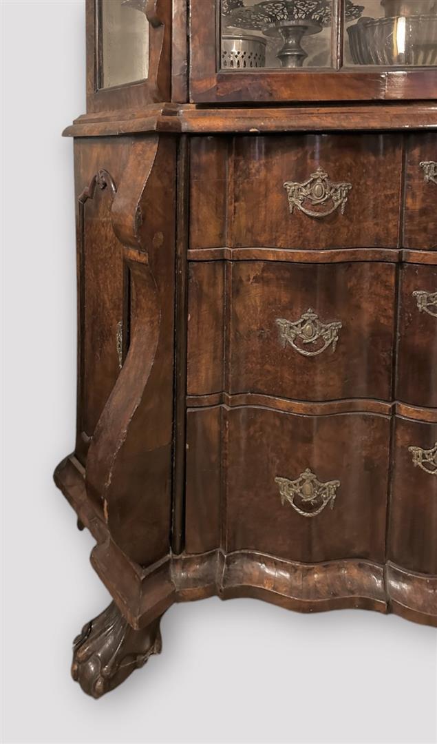 A Dutch organ arched, mahogany display case with carved crest and doors in the knees. Ca. 1760/70. Height: 207 x Width 125 x Depth 37 cm. NB: The contents of this case do not belong to this lot.