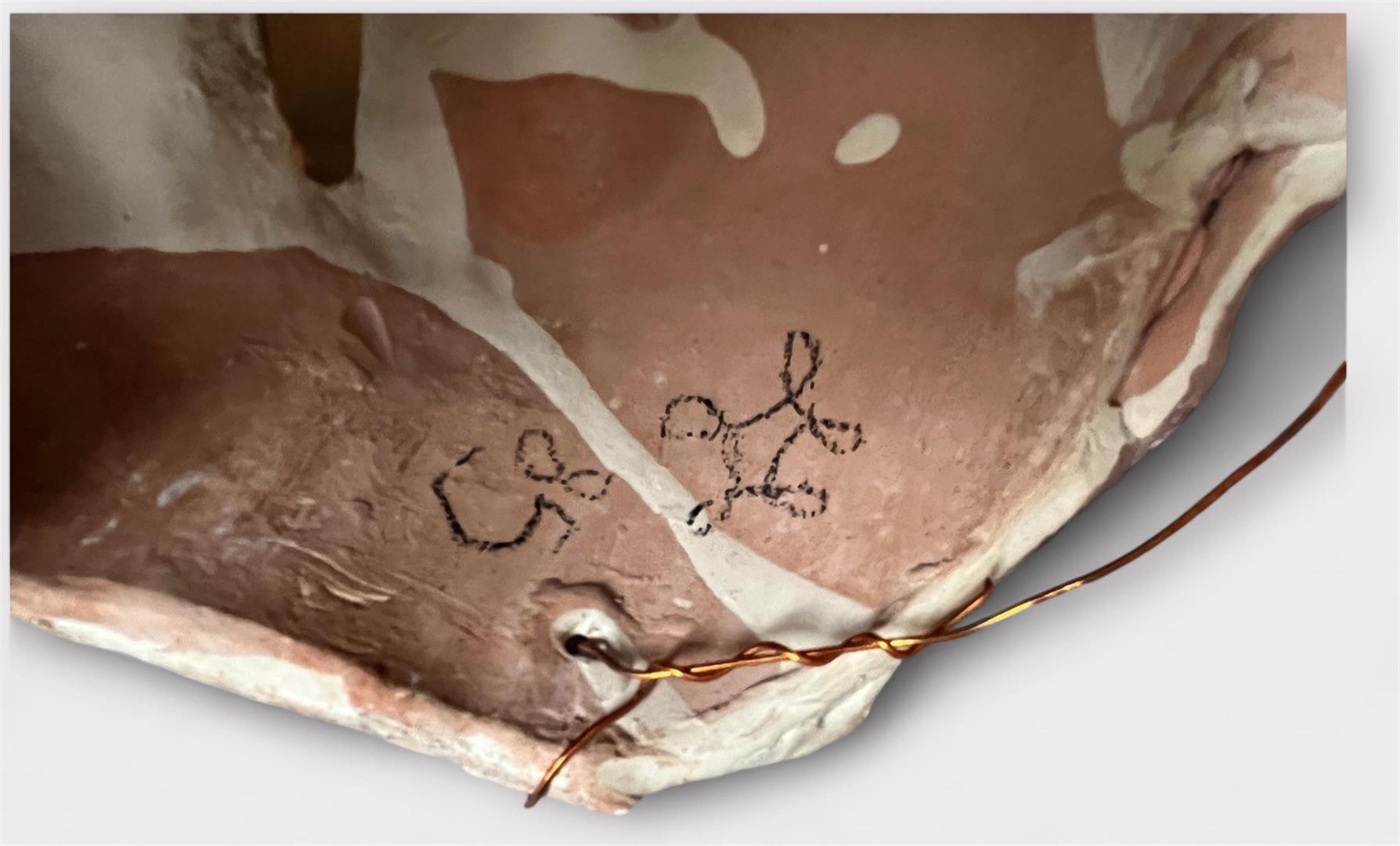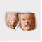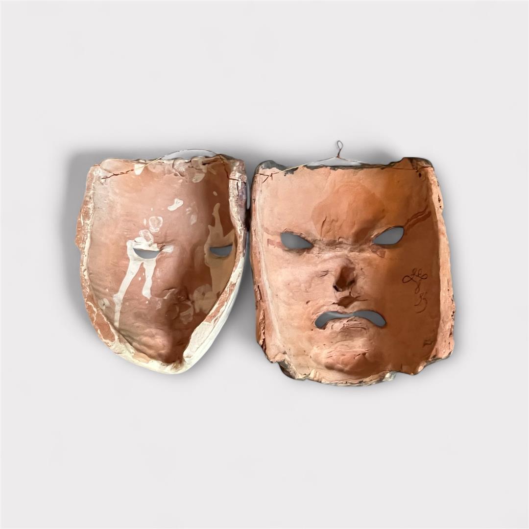 Two polychrome terracotta masks, marked and dated on the inside. 24 x 18 cm.