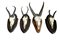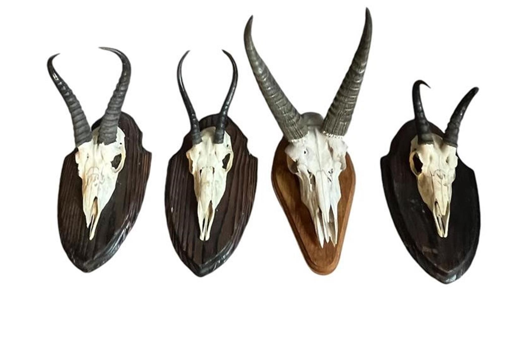 A lot of four taxidermy skulls of a roe deer, on wooden shield.