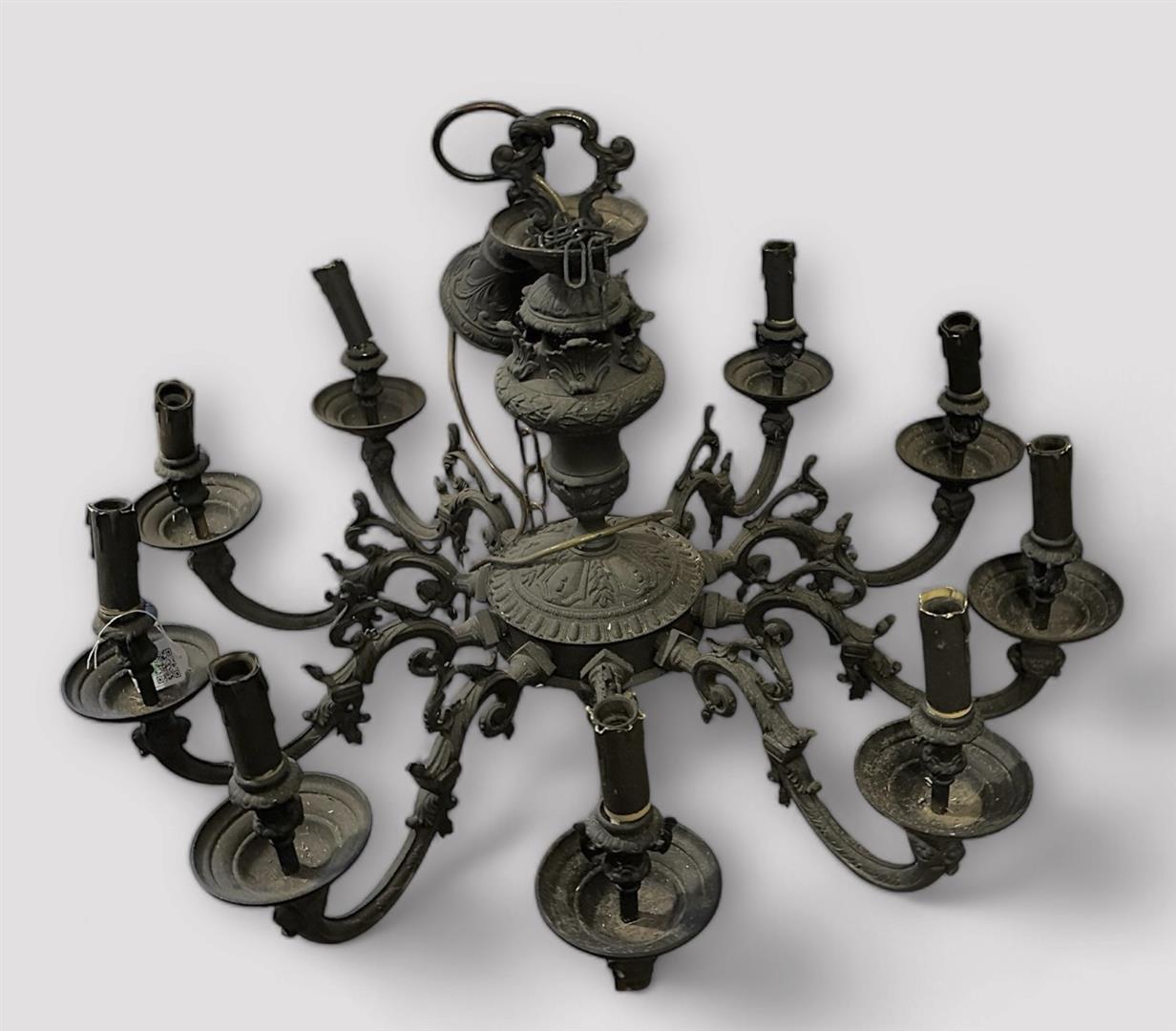 A ten-arm cast iron chandelier converted from gas to electricity, France ca....