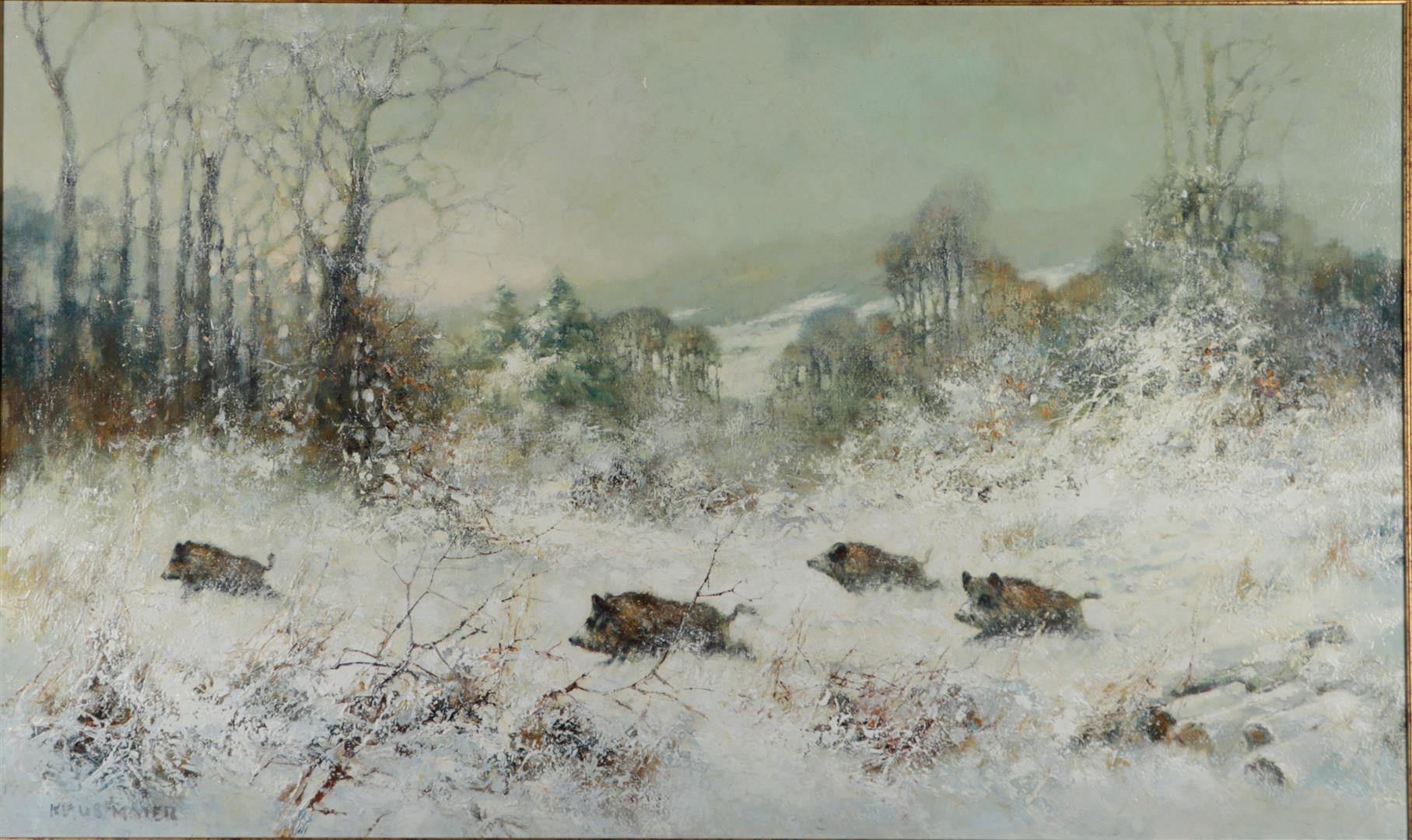 German School, Crossing Pigs in Winter, signed 'Klausmaier' (lower right).,...