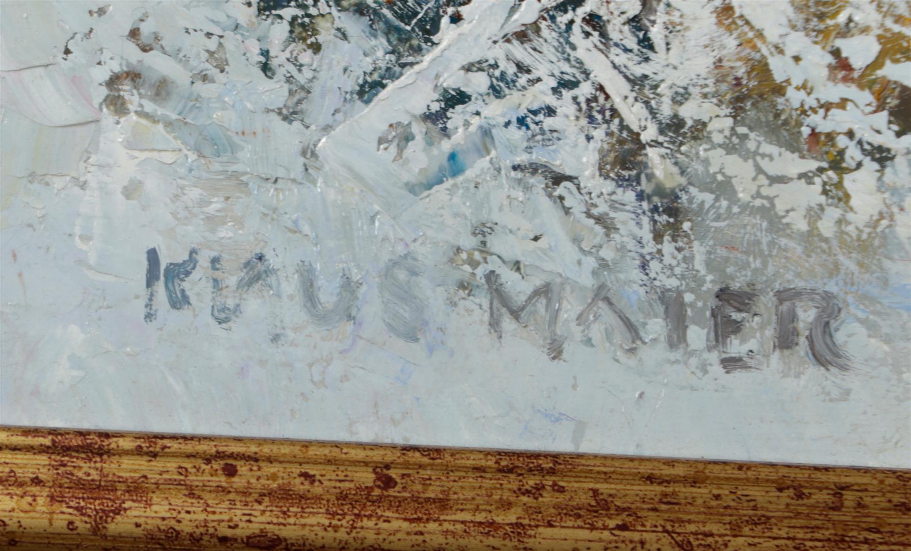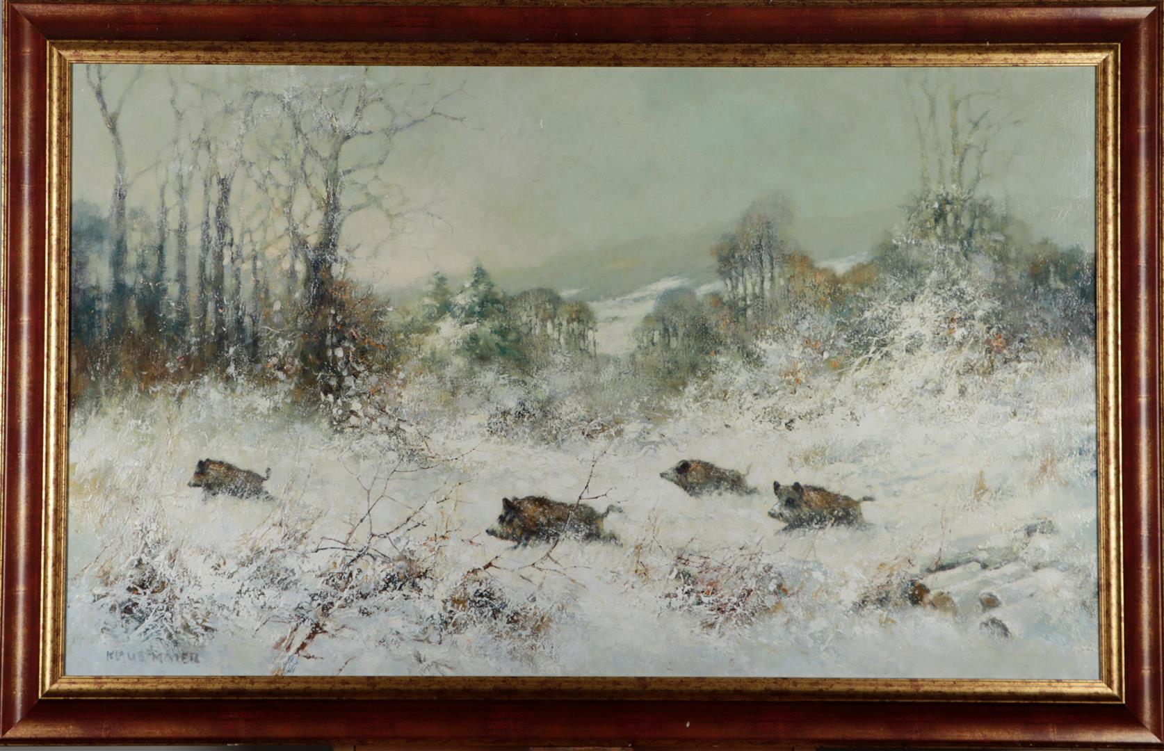 German School, Crossing Pigs in Winter, signed 'Klausmaier' (lower right)., oil on canvas.