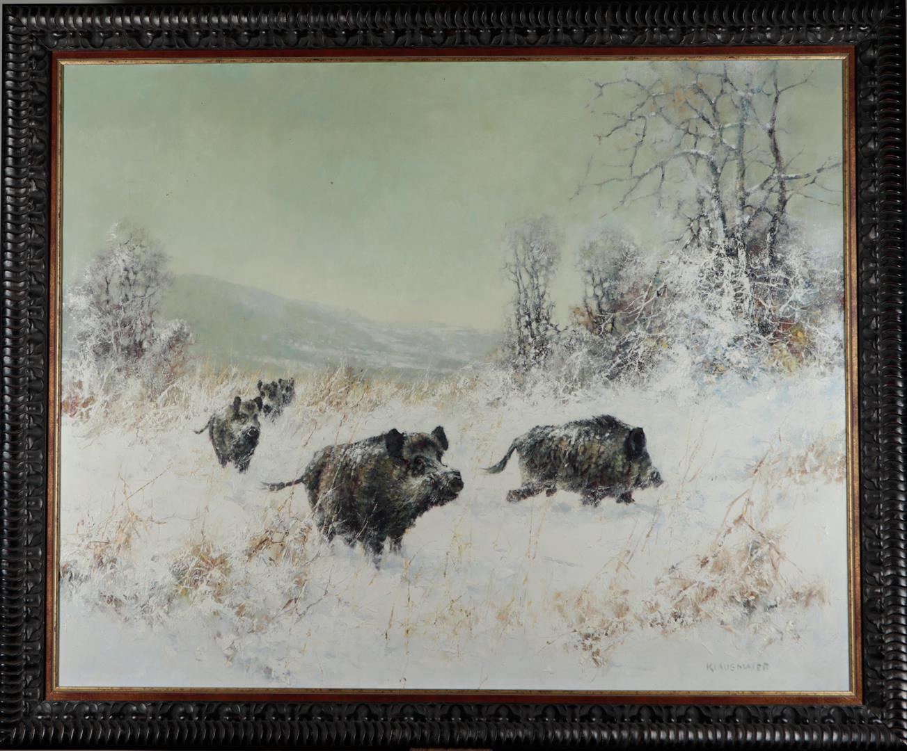 German School, Wild Boars in the Snow, signed "Klausmaier" (lower right), oil on canvas,