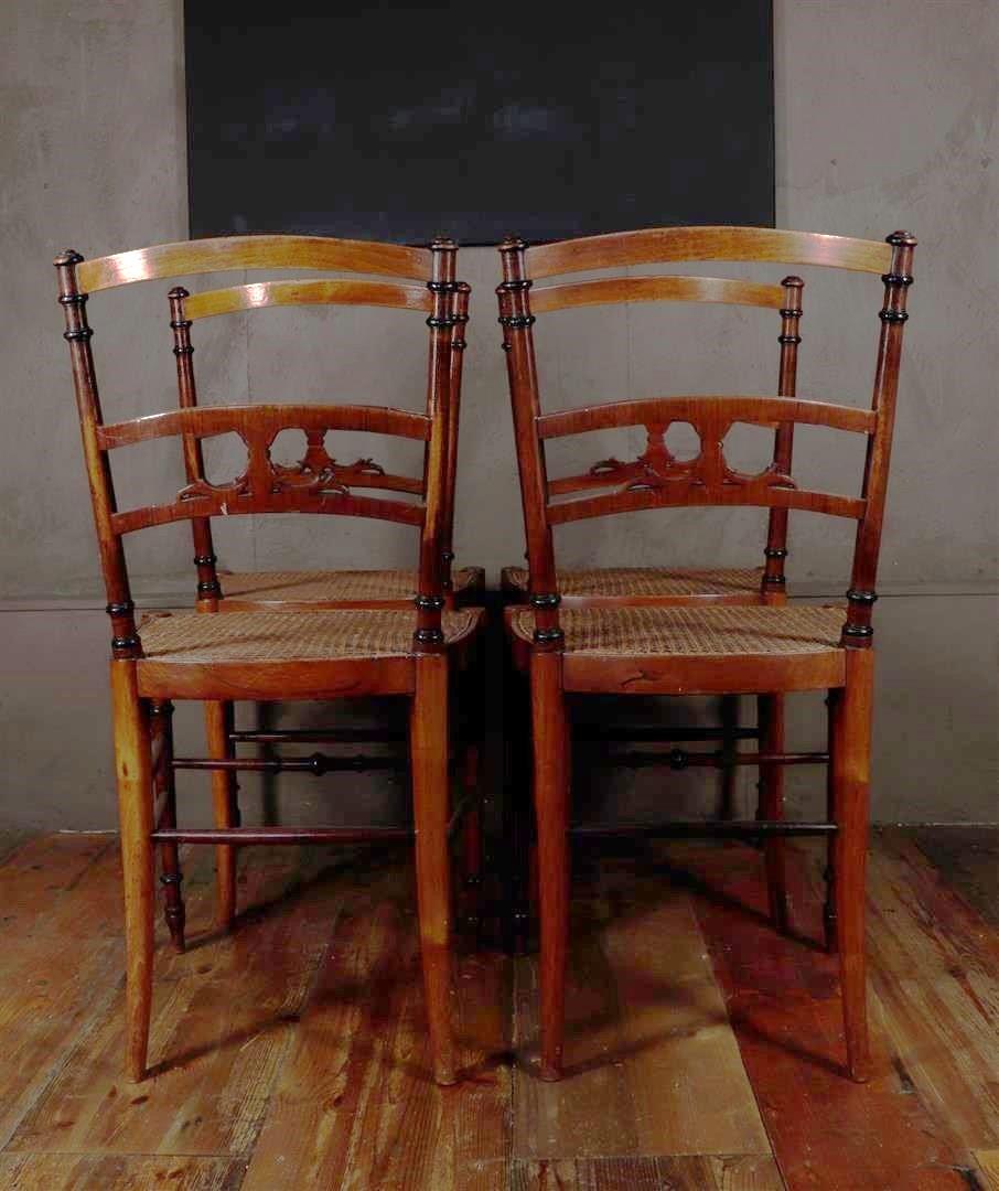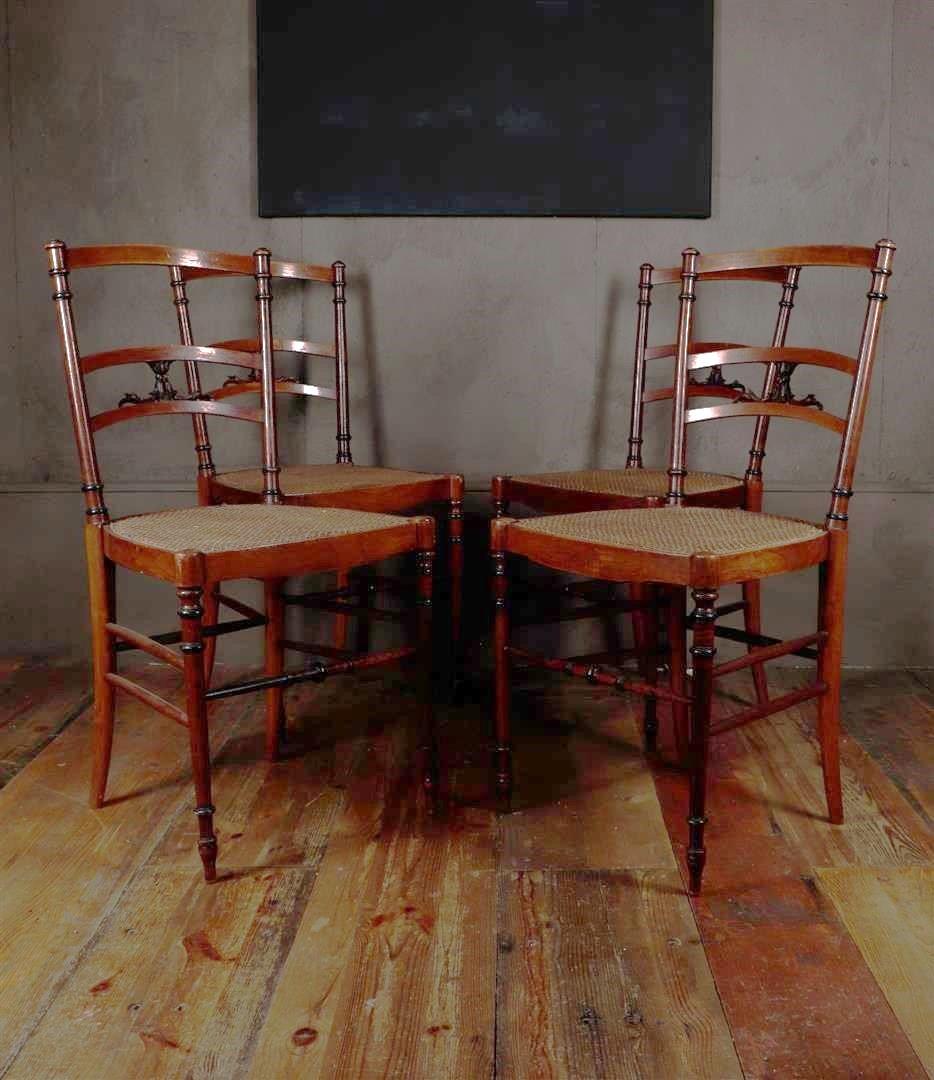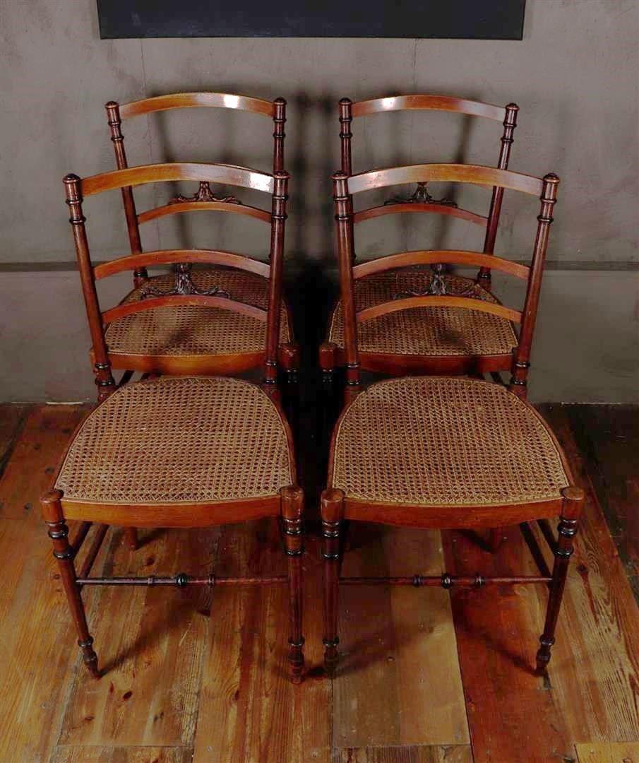 A set of (4) early Arts & Crafts chairs with wicker seat. Seat height 42.5 cm. England ca. 1880.