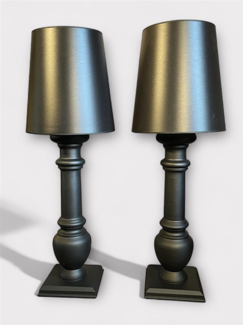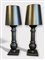 A set of black lacquered wooden table lamps with a black shade.