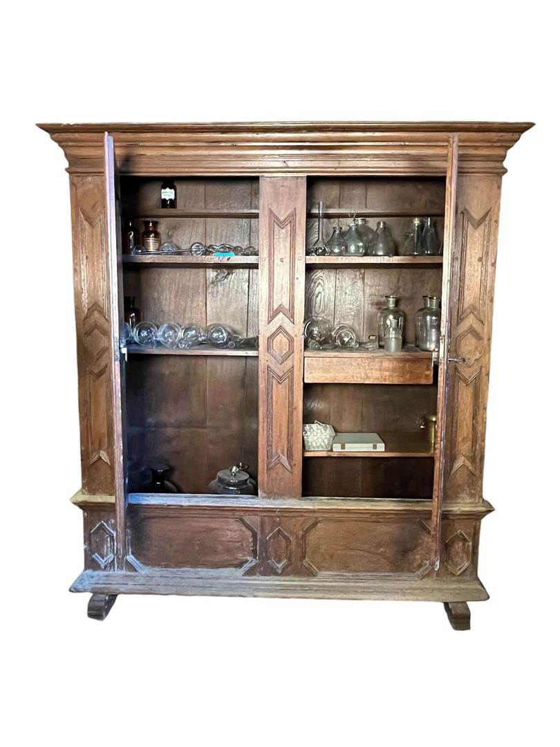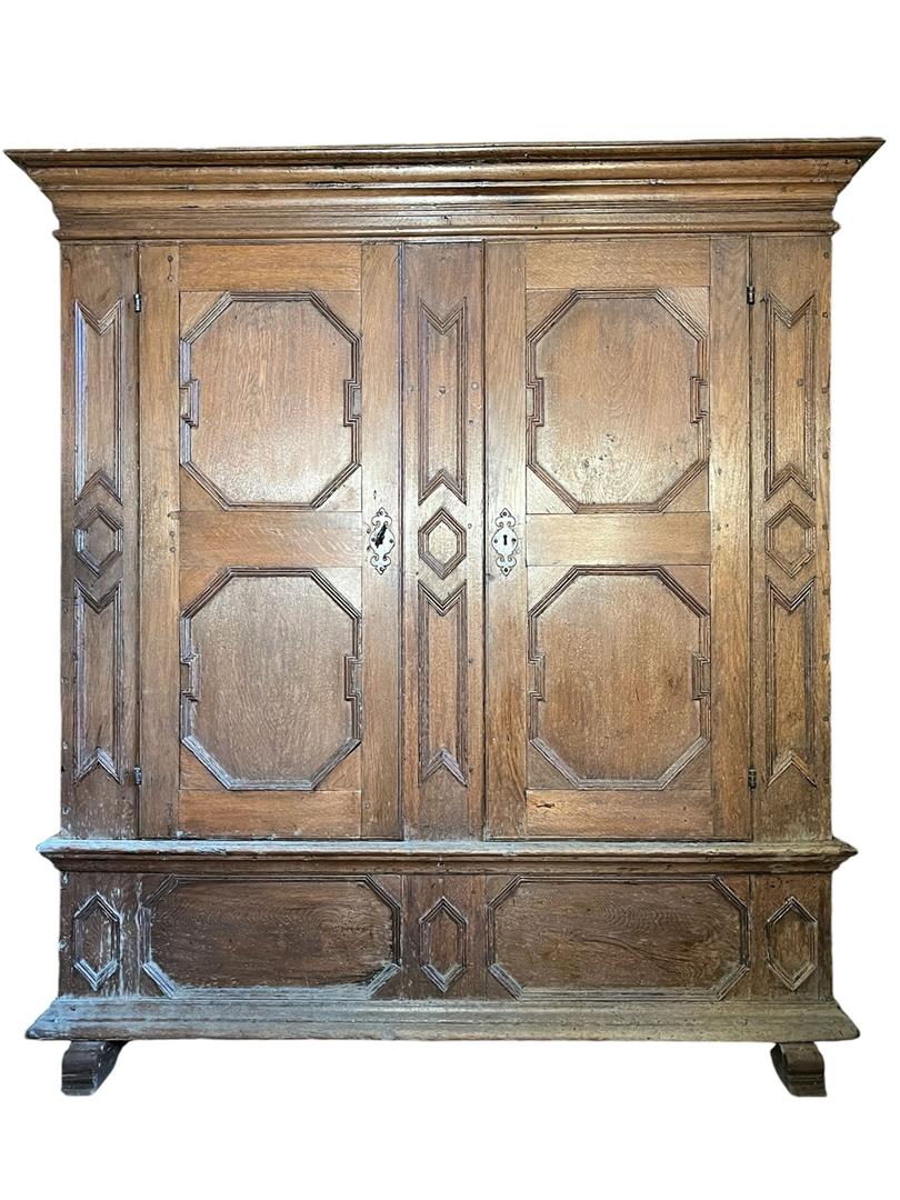 A German oak bread cupboard / linen cupboard, with two doors with shelves behind them. 18th century.