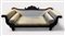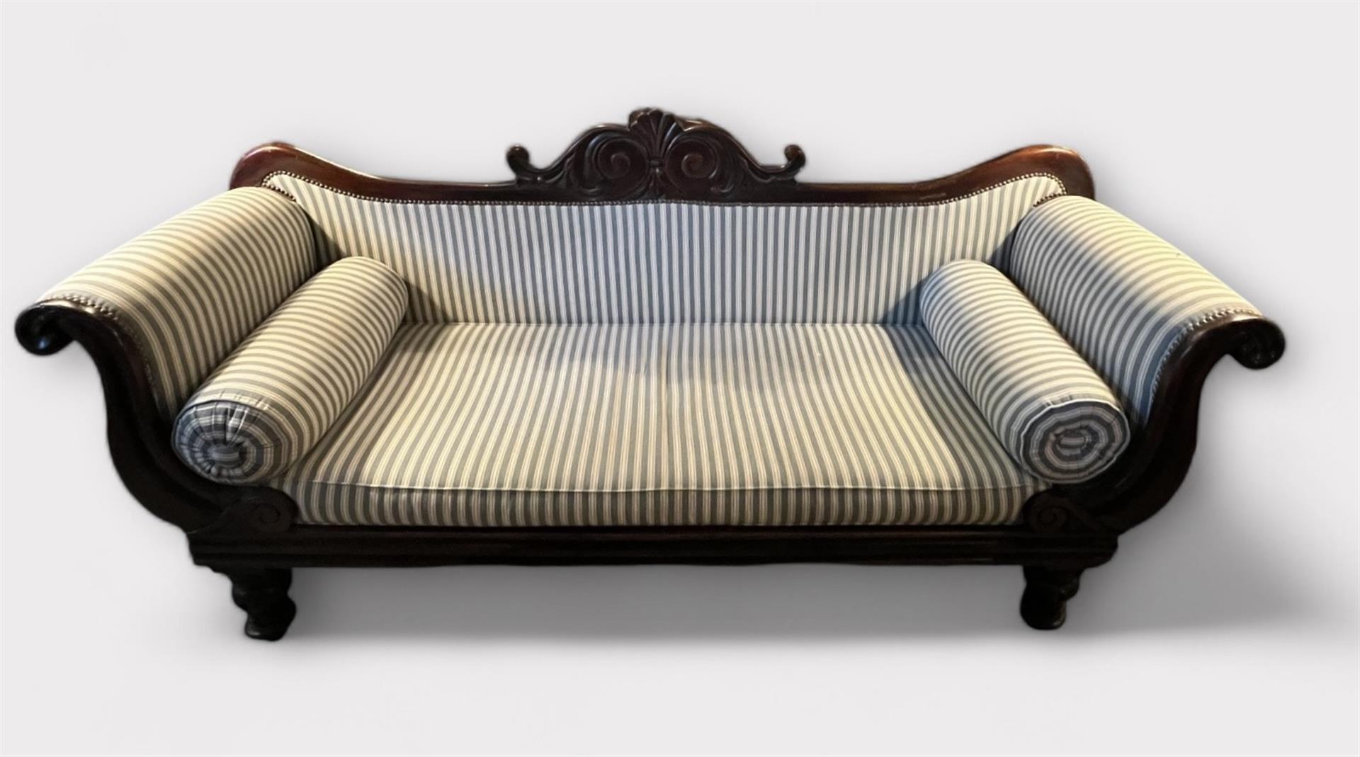 A Regency sofa upholstered in striped, light blue fabric. Bolster cushions on...