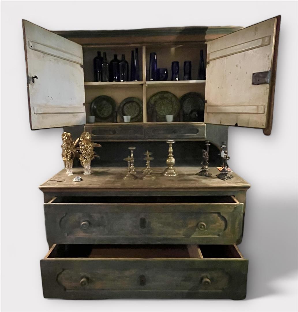 A green and brown polychrome, 18th century Scandinavian sideboard. In the lower cabinet two large drawers. The upper cabinet has two doors under which two smaller drawers. NB: The contents of the cabinet and the displayed small items do not belong to this lot.