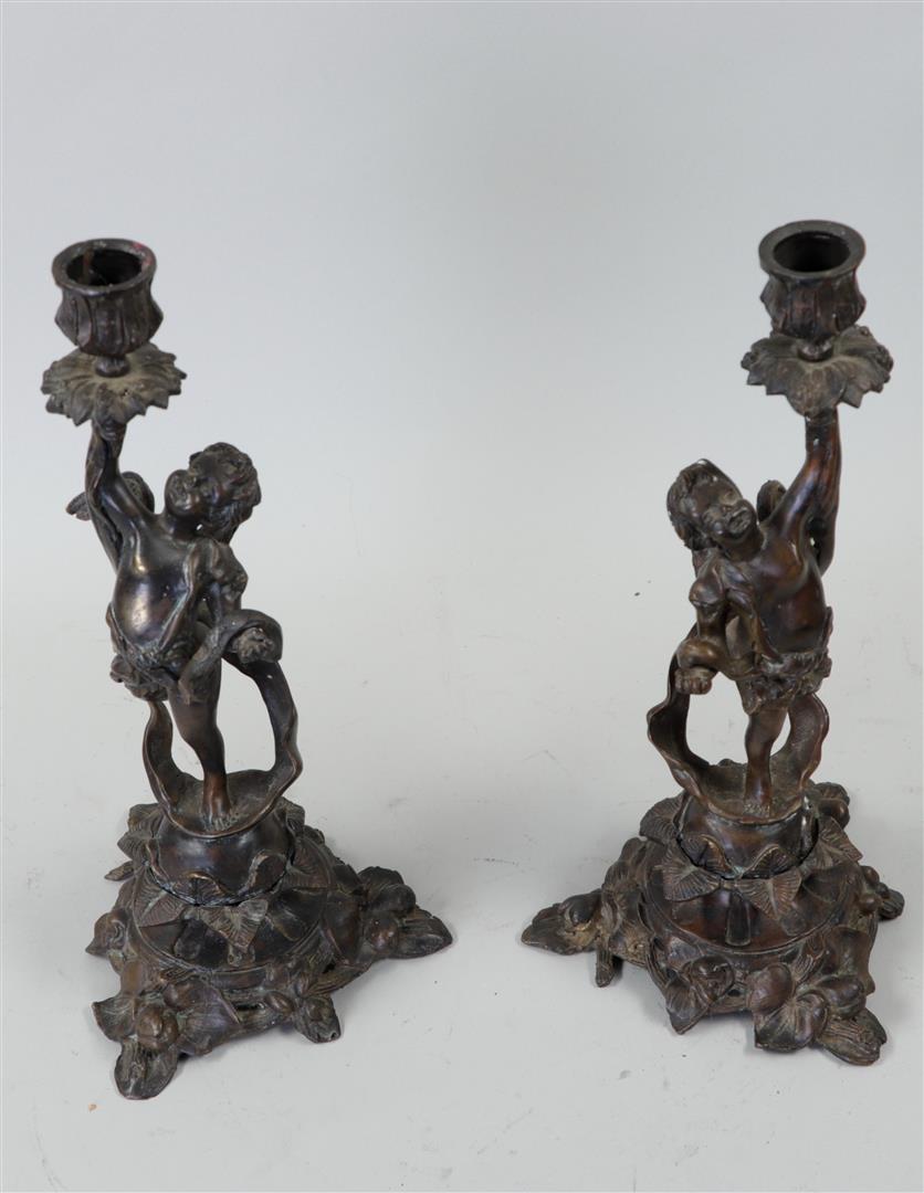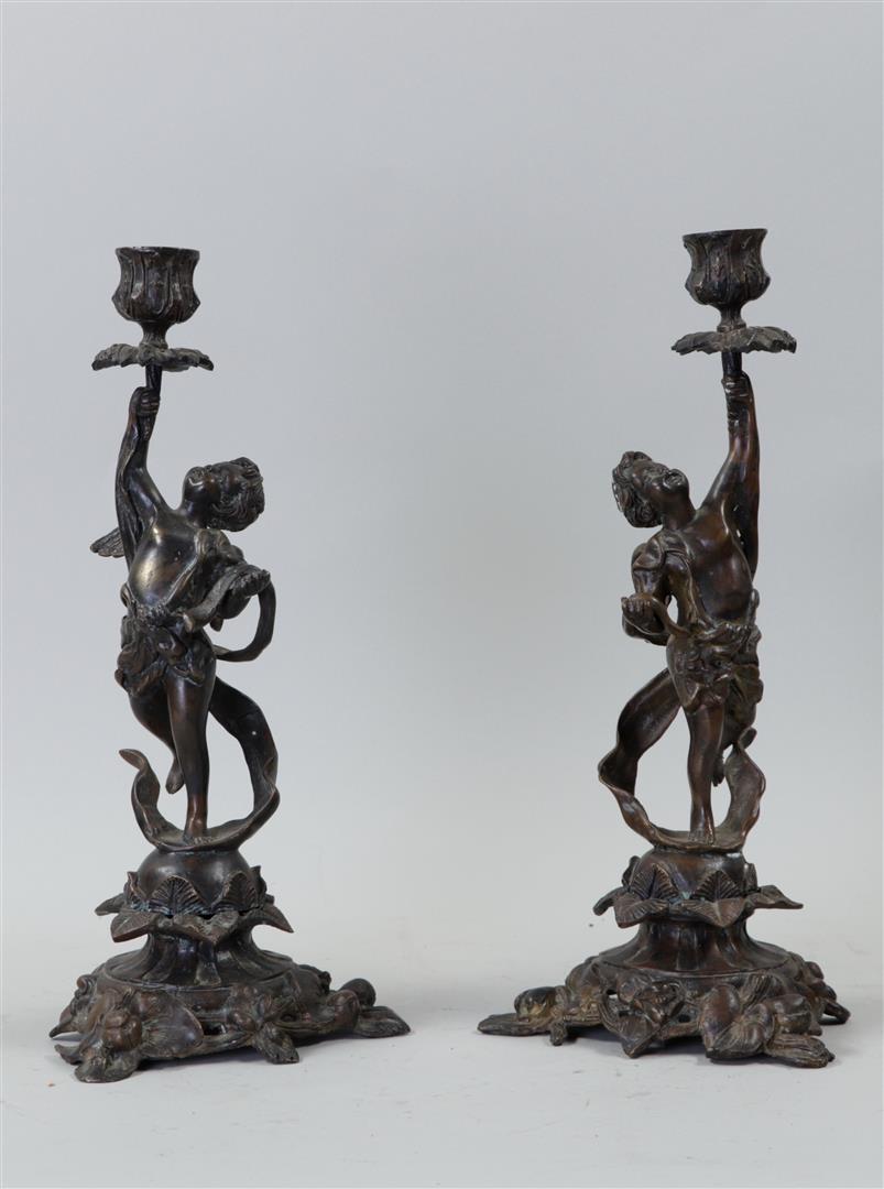 Lot 198 | A pair of bronze candlesticks with putto on grapevine base. Circa 1870. H. 33...