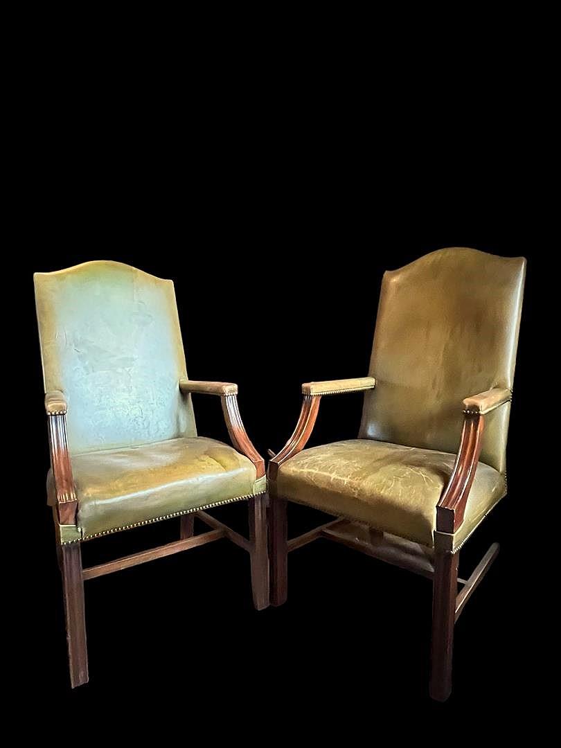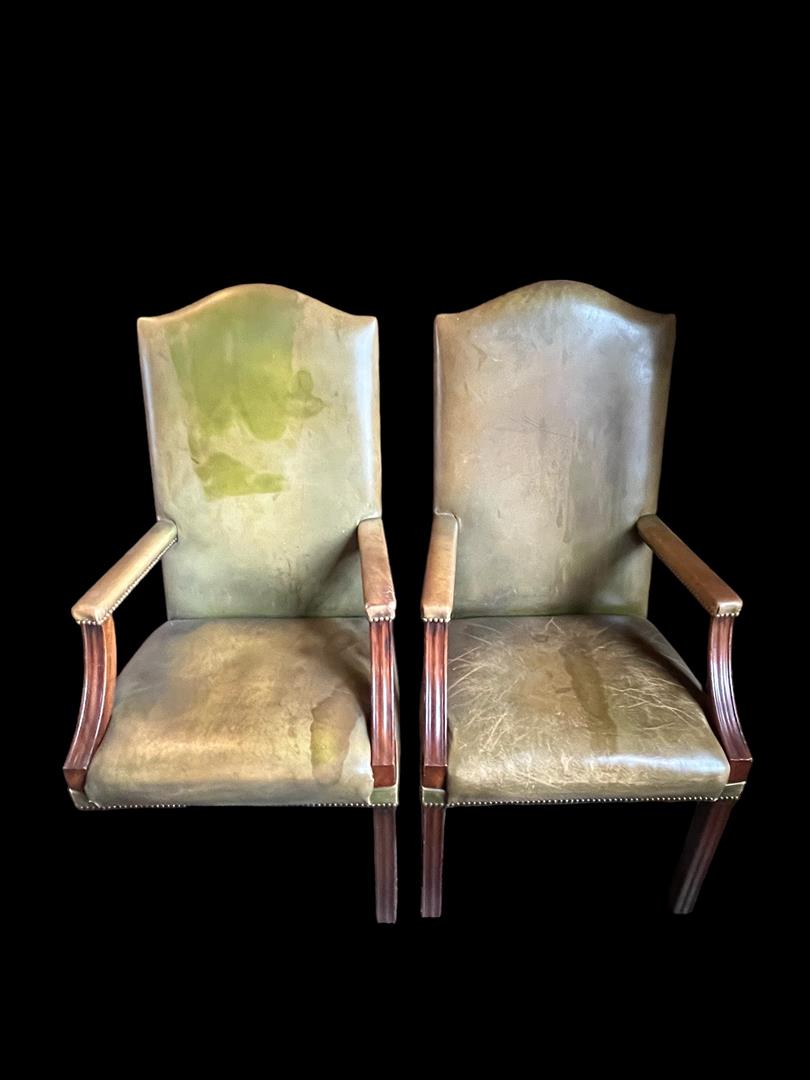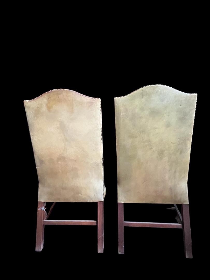 A set (2) of high backed green leather upholstered desk chairs. 19th century....