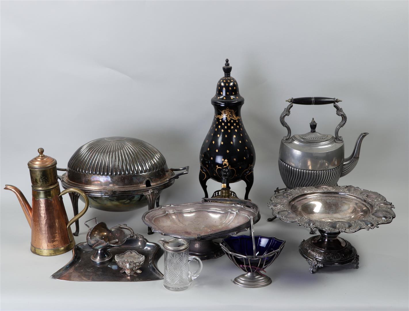 A collection including a silver-plated bowl, bowls, a tap and two silver items.