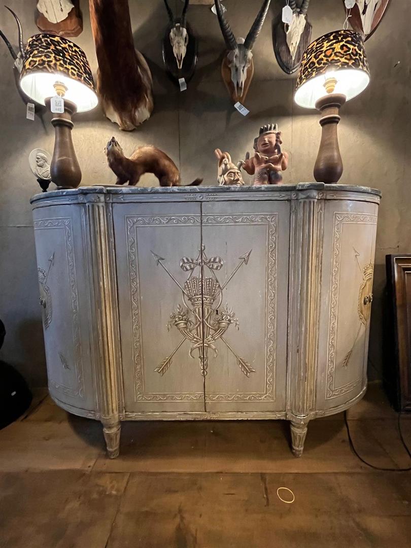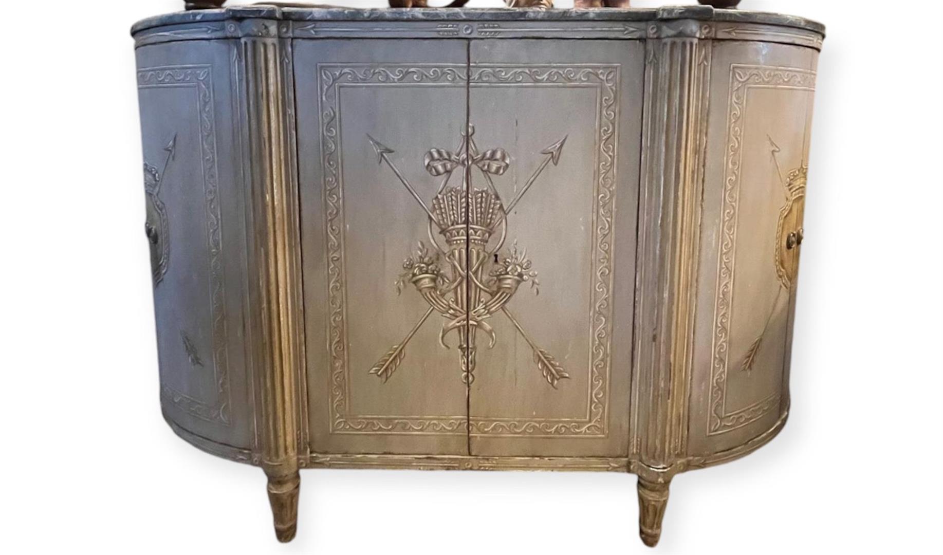 A green lacquered and decorated sideboard with faux marble top, 19th century. 185 x 172 x 45 cm.