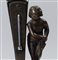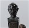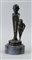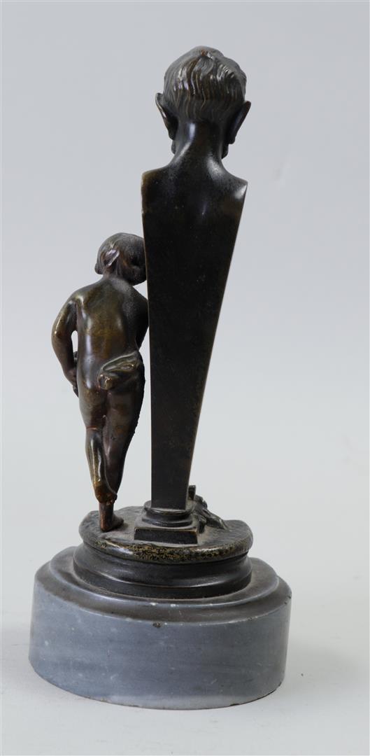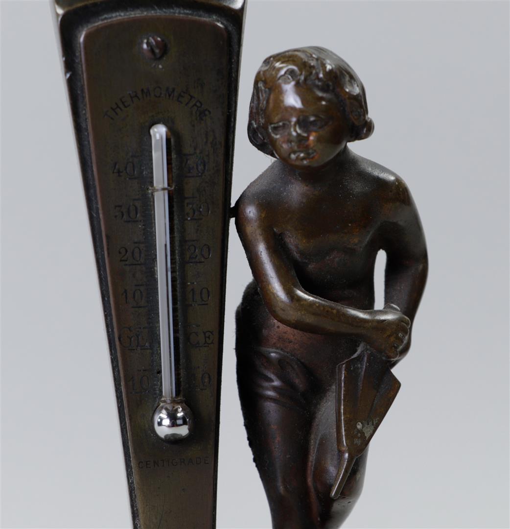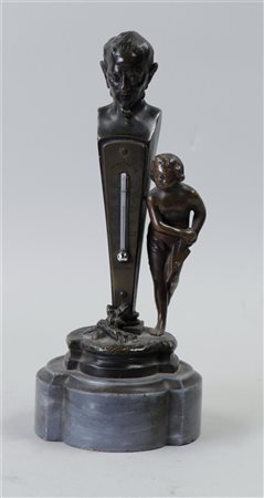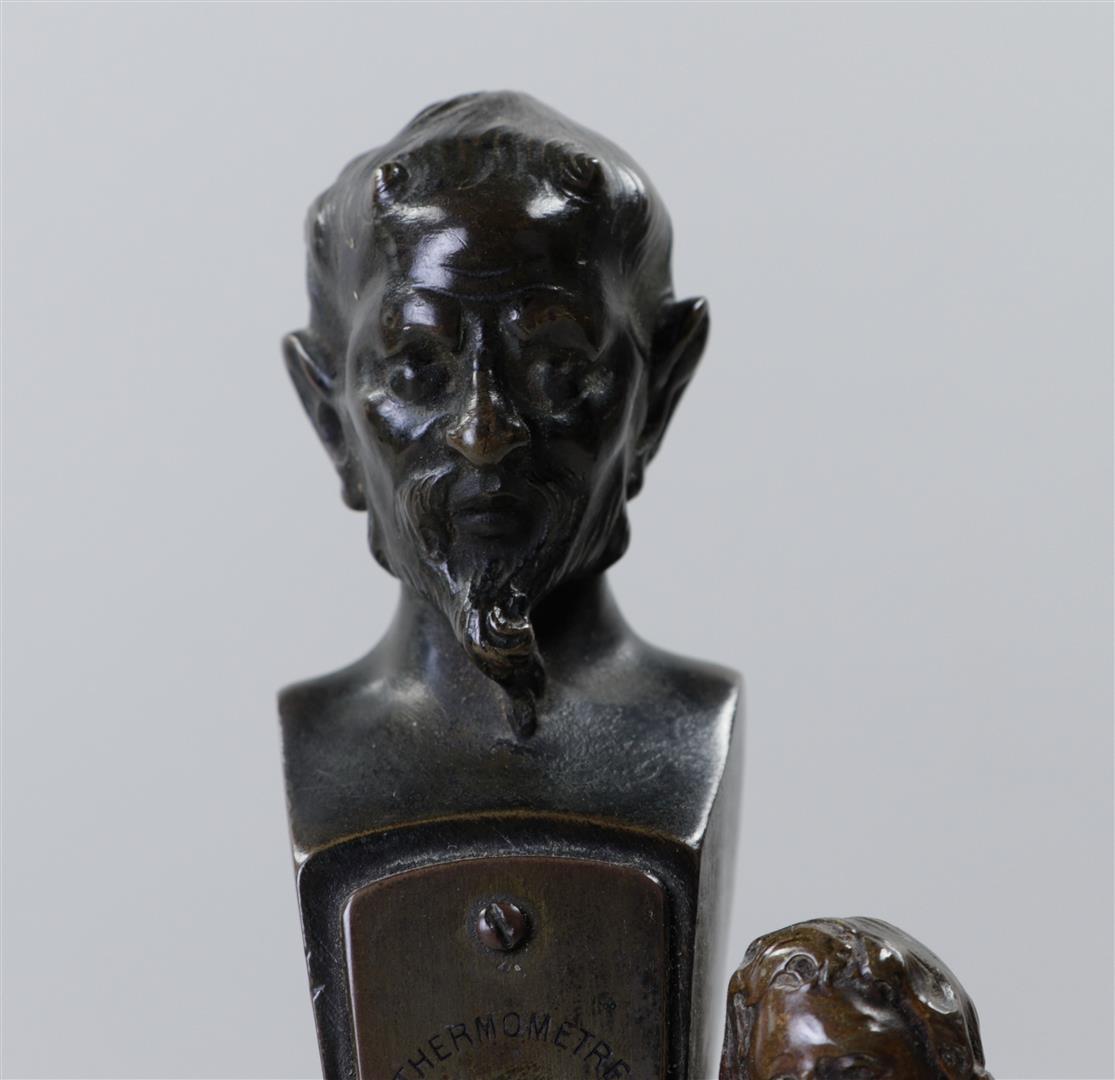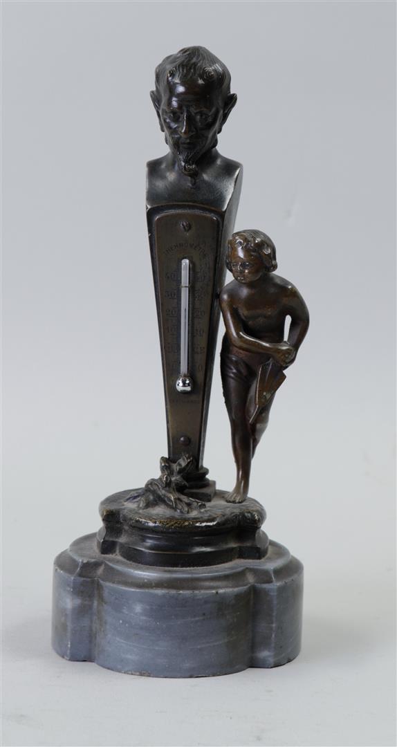 A desk ornament, thermometer 'A youth stoking a fire at a bust of a satyr', bronze, 19th century. Height (including marble base) 22.5 cm.
