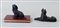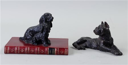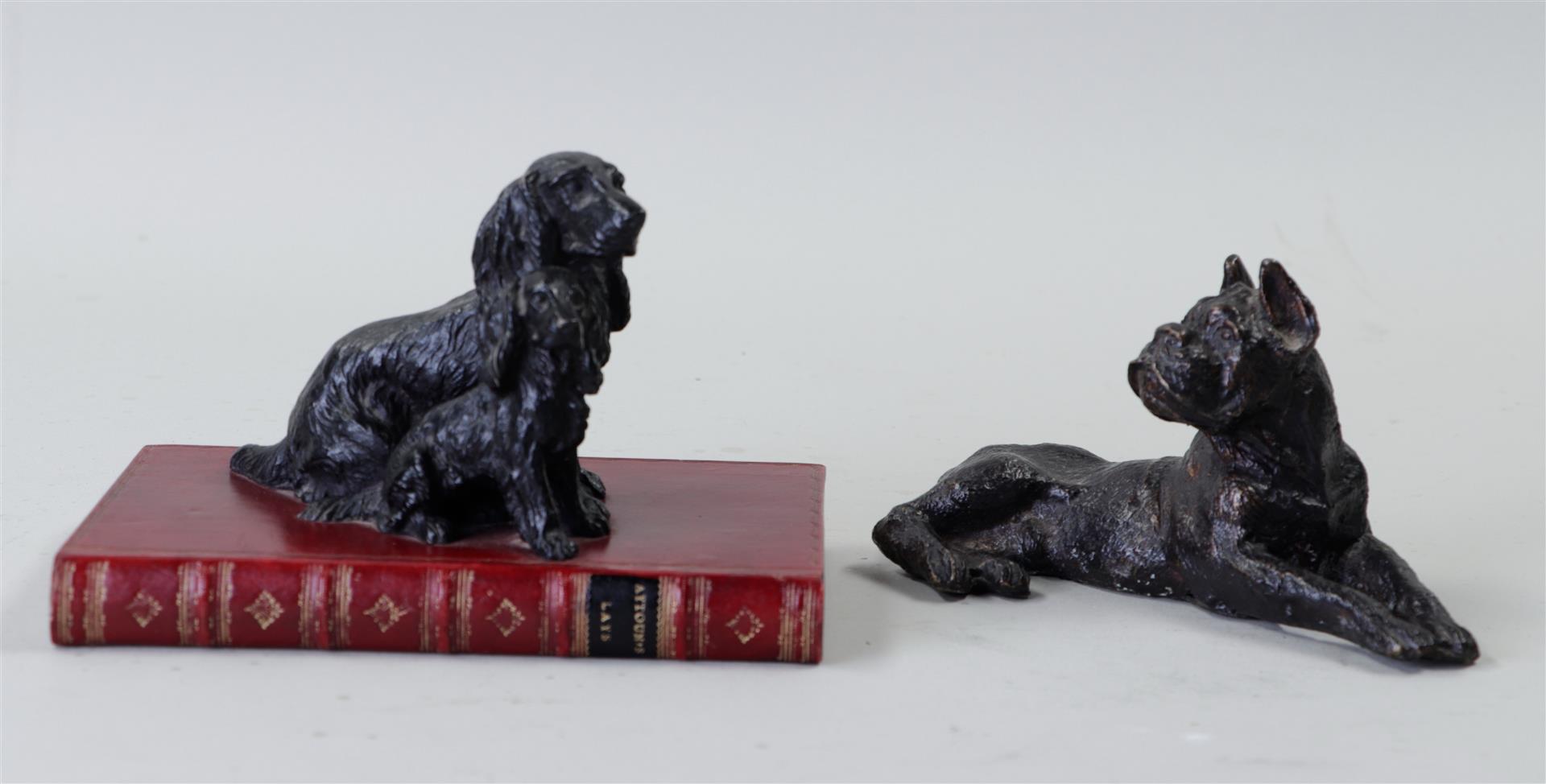 A lot of two patinated metal figures of a dog, a couple of which are sitting on a book.