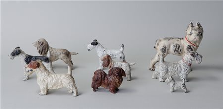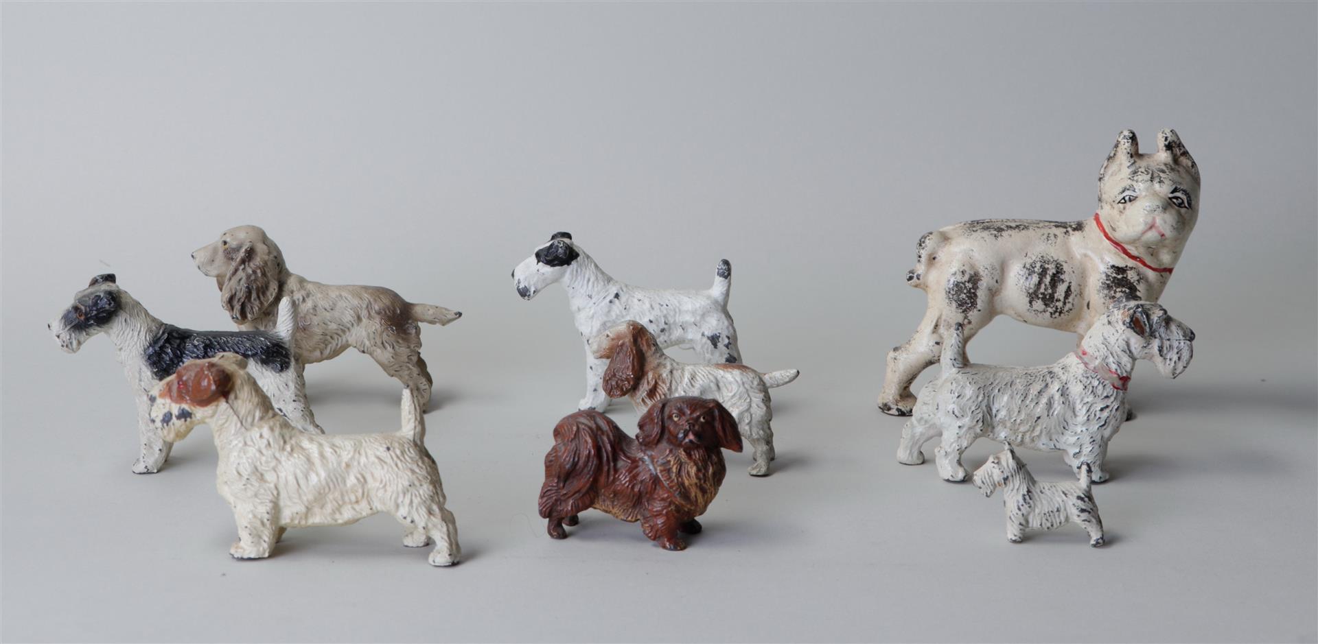 A collection of nine antique cold painted metal dogs.