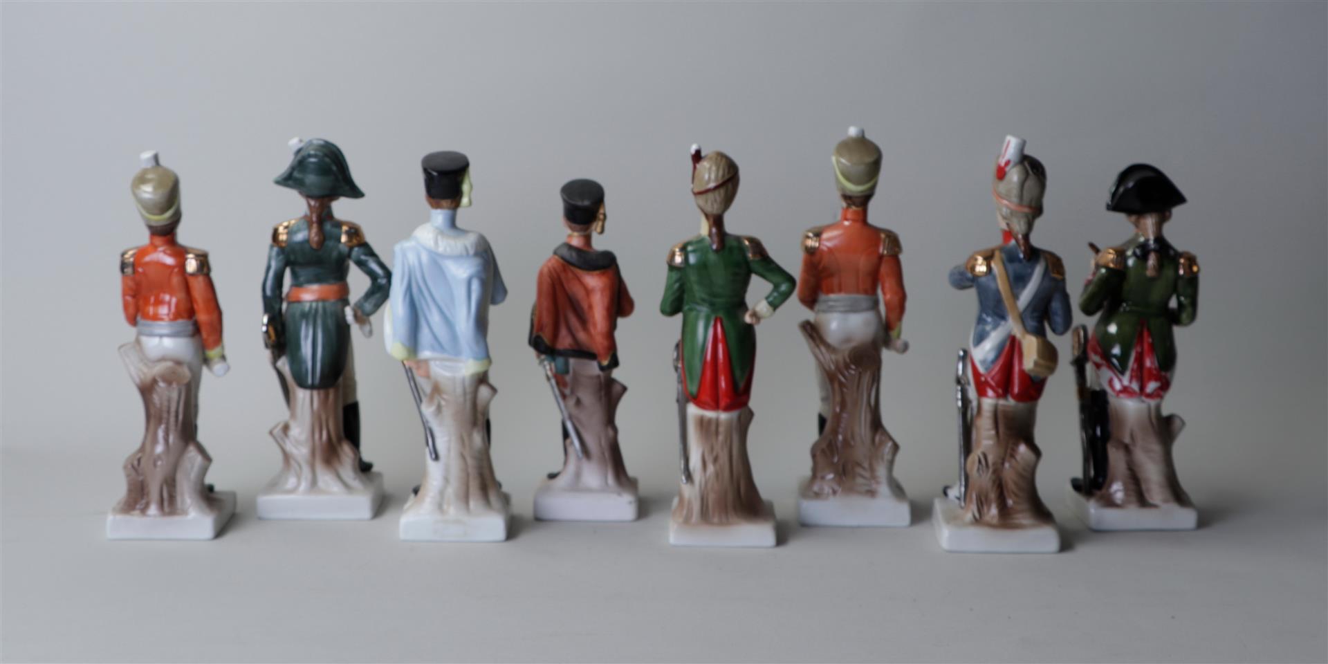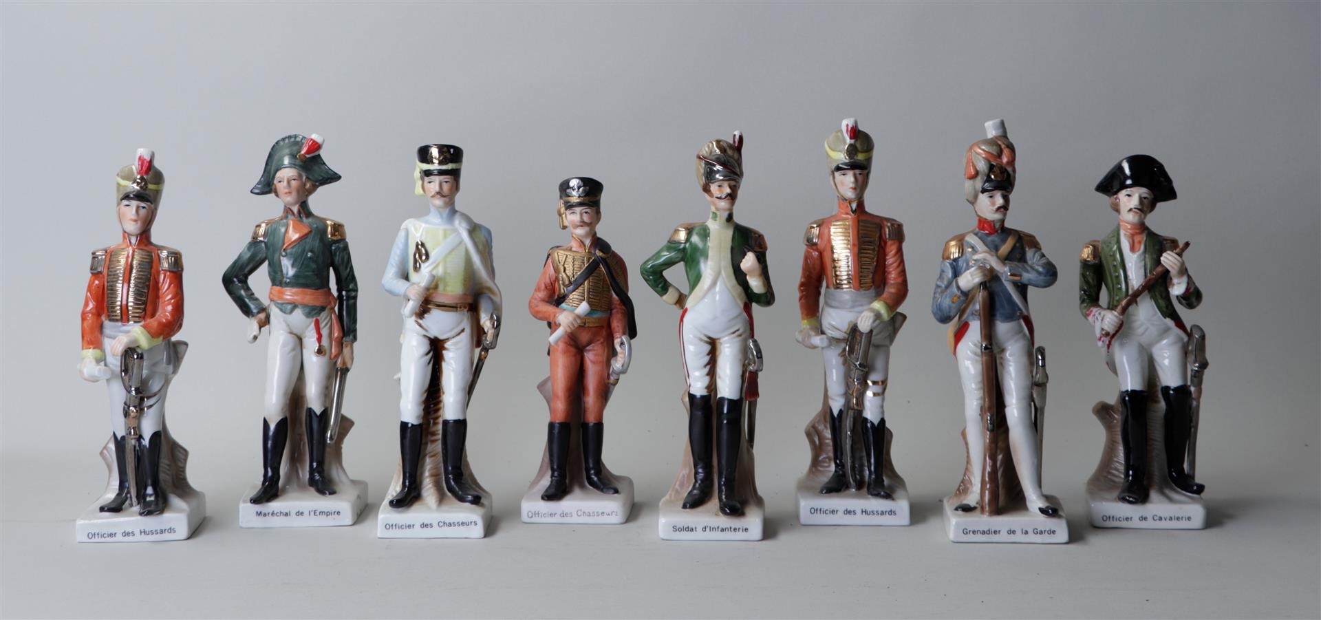 A group of (8) Alfretto porcelain figurines of officers in uniform from the early 19th century.