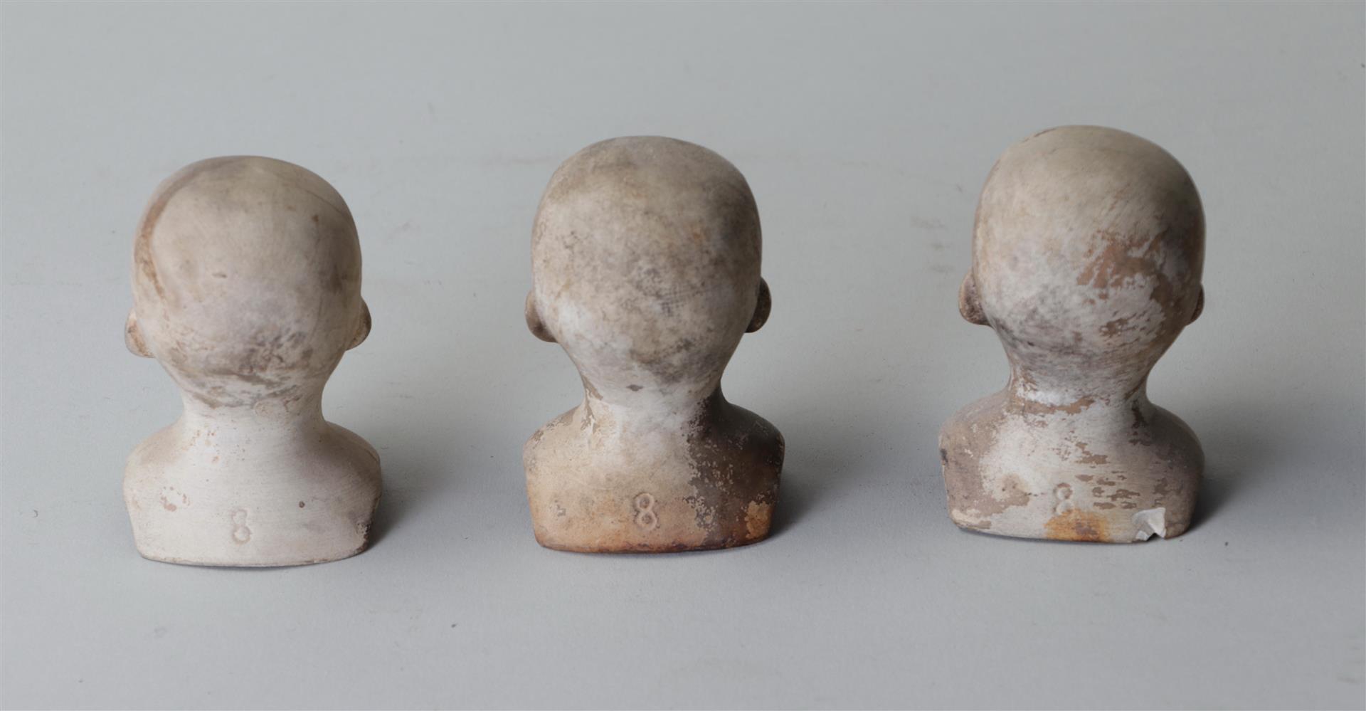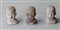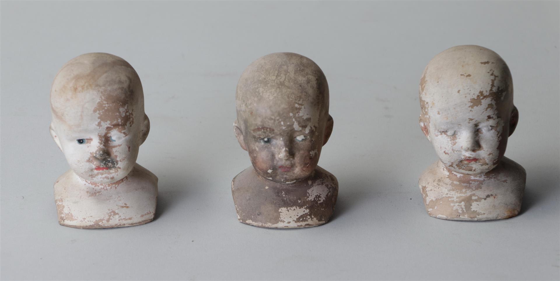 A lot containing (3) painted, biscuit baked doll heads, ca. 1900. H.: 8 cm.