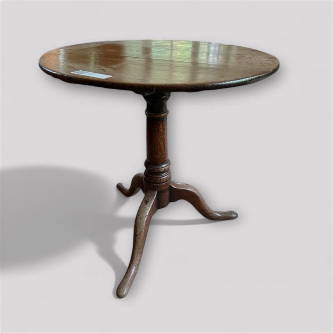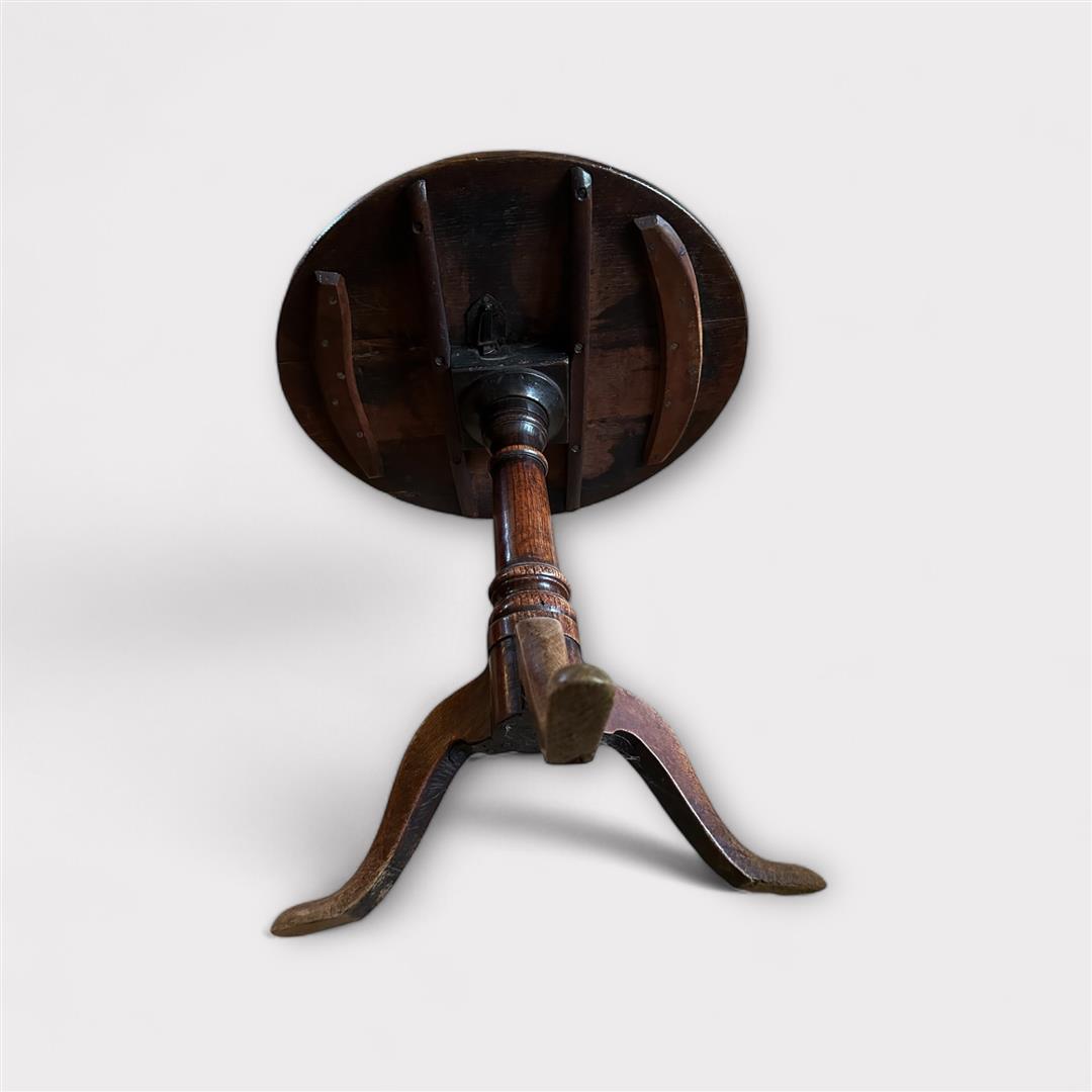 A late 18th century oak side table or port table on one leg with three feet. Folding top. Height: 54 cm. x Diam.: 65 cm.