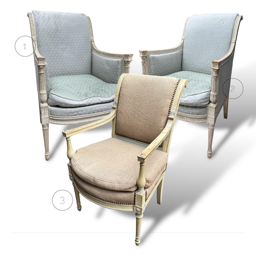 A set of (2) Louis XVI armchairs and a matching desk chair, France ca. 1780/90.