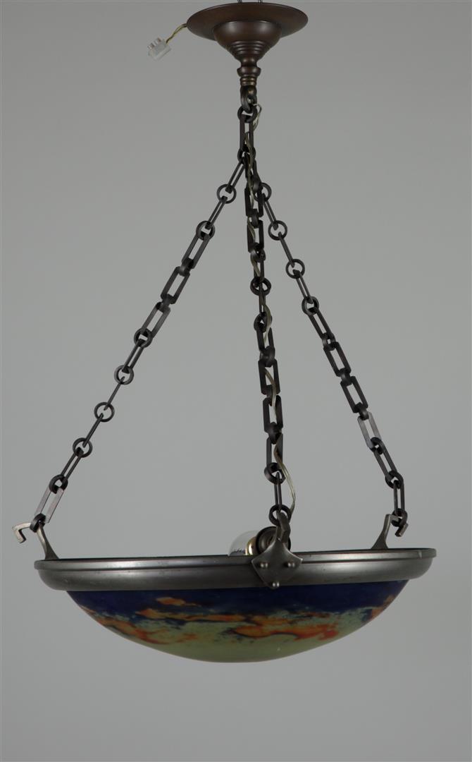 An art nouveau hanging lamp with colored glass bowl.