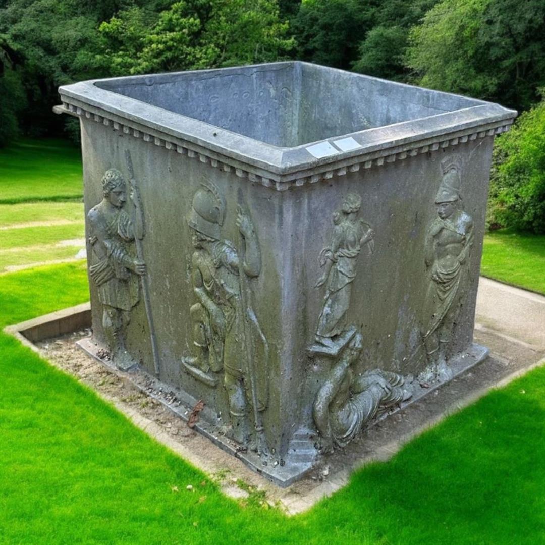 A traditional cast lead cistern or planter. With decorations of classical scenes in high relief.