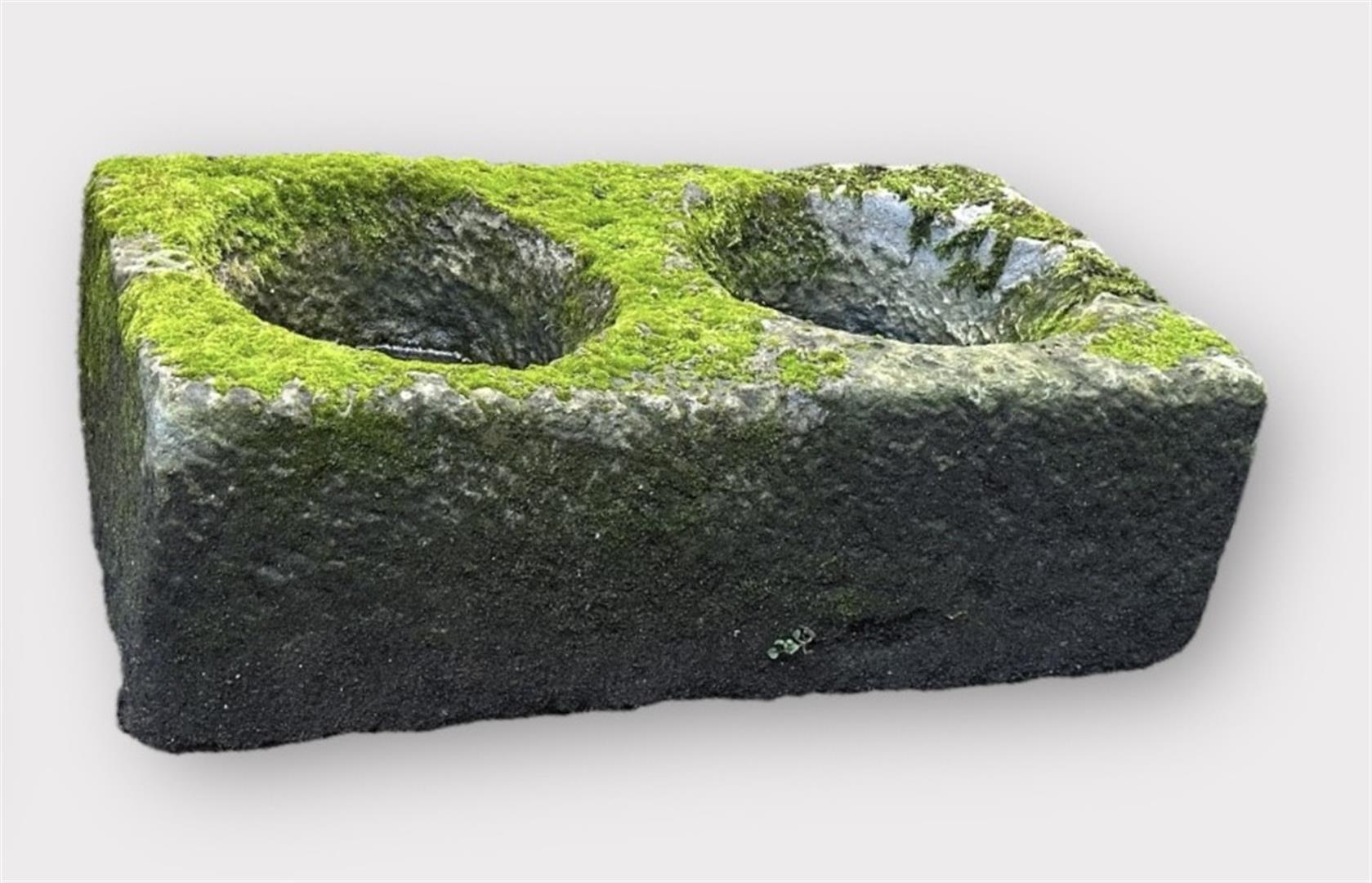 A stone trough with two carved compartments. 81 x 43 x 28 cm.